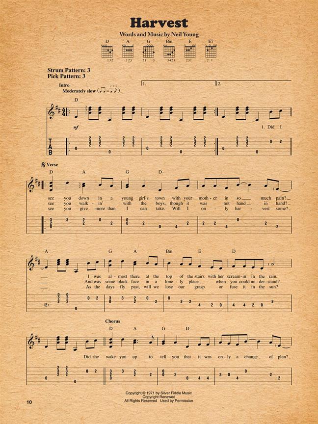 Neil Young: Récolte contient des dispositions faciles à onglet pour les dix chansons sur CD.Including séminal de Neil Young en fin de semaine et Heart Of Gold.