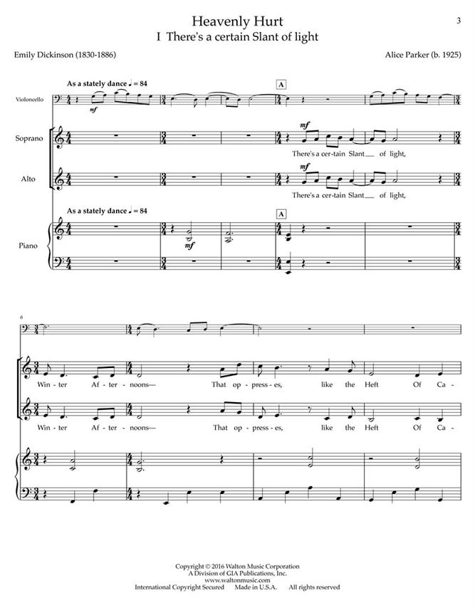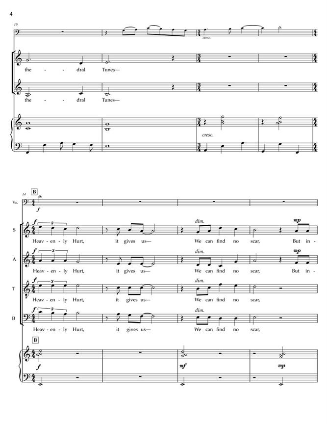 A multi-movement work for Choir, Piano and Cello from Alice Parker using several Emily Dickinson poems. The work features expertly crafted Vocals that are both complex and singable. The Piano is supportive and yet exists as its own entity. The Cello soars above as a heavenly voice. A fantastic selection for high school, university and community choirs. Separate Cello part available.