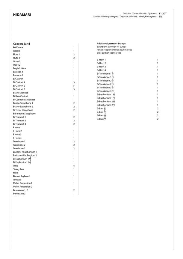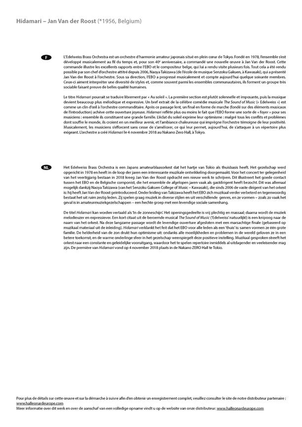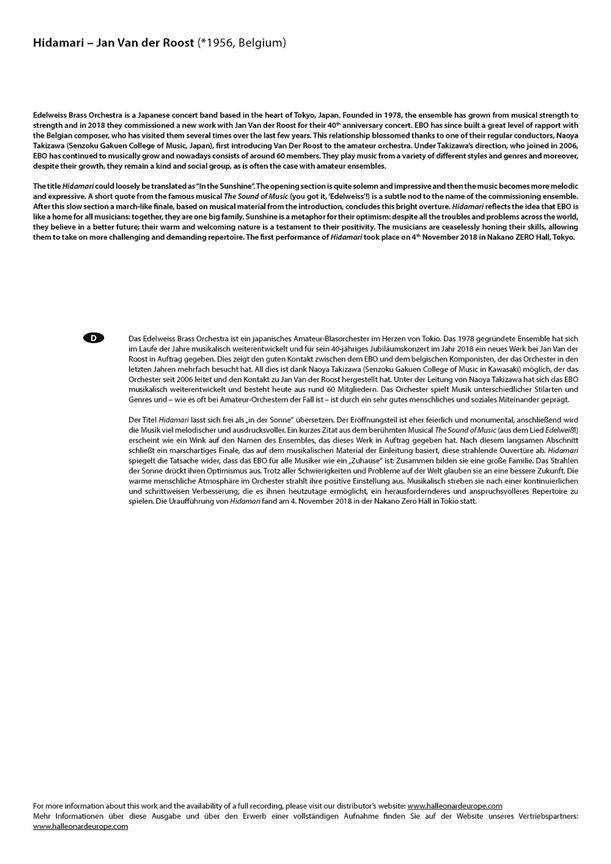 L’Edelweiss Brass Orchestra est un orchestre d’harmonie amateur japonais situé en plein cœur de Tokyoù Fondé en 1978, l’ensemble s’est développé musicalement au fil du temps et, pour son 40e anniversaire, a commandé une nouvelle oeuvre Jan Van der Roost. Le titre Hidamari pourrait se traduire librement par «Au soleil». Un bref extrait de la célèbre comédie musicale The Sound où Music («Edelweiss») est comme un clin d’œil l’orchestre commanditaire. Hidamari reflète plus où moins le fait que l’EBO forme une sorte de «foyer» pour ses musiciens: ensemble ils constituent une grande famille.