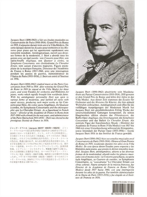 Jacques Ibert (1890-1962) studied at the Paris Conservatoire before embarking upon a successful composing career. Histoires increased his popularity when it was published in the mid-1920s and Marcel Moyse (1889-1984), a prominent French flautist, arranged the compilation for Flute and Piano in 1933 to great acclaim. Histoires for Flute and Piano is made up of six movements: 1) The Leader of the Gold Turtles, 2) The Little White Donkey, 3) In the Sad House, 4) The Crystal Cage, 5) The Market of Fresh Water, and 6) The Procession of Balkis. Containing a variety of musical aspects and techniques, Moyse's arrangement for Flute and Piano of Ibert's Histoires is an exciting addition to the intermediate level flautist's repertoire. Jacques Ibert (1890-1962) studied at the Paris Conservatoire before embarking upon a successful composing career. Histoires increased his popularity when it was published in the mid-1920s and Marcel Moyse (1889-1984), a prominent French flautist, arranged the compilation for Flute and Piano in 1933 to great acclaim. Histoires for Flute and Piano is made up of six movements; 1) The Leader of the Gold Turtles, 2) The Little White Donkey, 3) In the Sad House, 4) The Crystal Cage, 5) The Market of Fresh Water, and 6) The Procession of Balkis. Containing a variety of musical aspects and techniques, Moyse 's arrangement for Flute and Piano of Ibert 's Histoires is an exciting addition to the intermediate level flautist's repertoire.