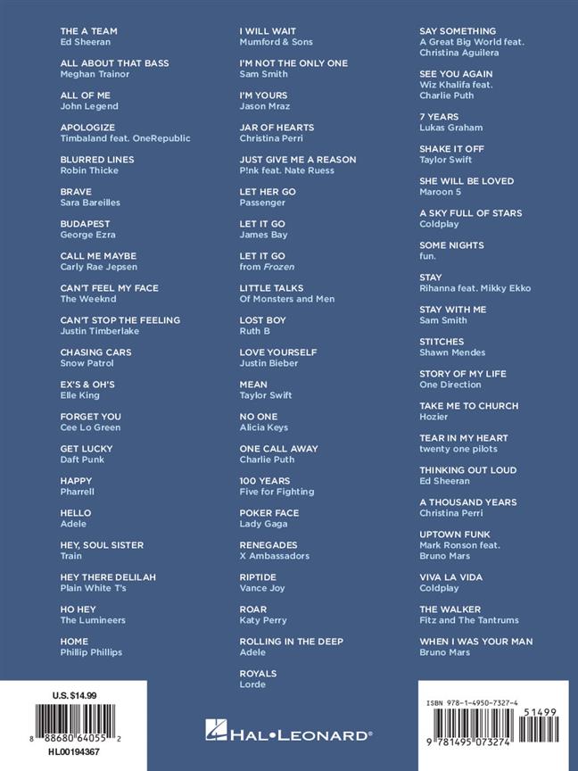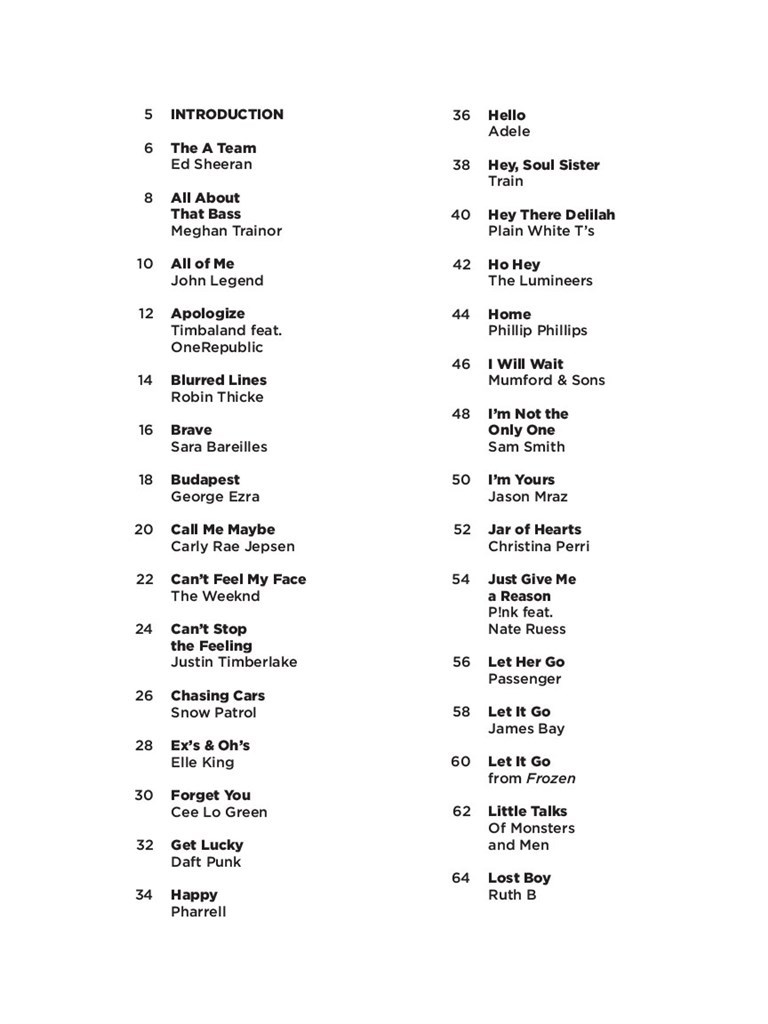 This edition includes 60 hit songs: All of Me, Brave, Can't Feel My Face, Ex's and Oh's, Get Lucky, Hey Soul Sister, Ho Hey, I'm Yours, Jar of Hearts, Lost Boy, Love Yourself, One Call Away, Riptide, Rolling in the Deep, Shake It Off, Stay with Me, Take Me to Church, Thinking Out Loud, A Thousand Years, When I Was Your Man and many more.