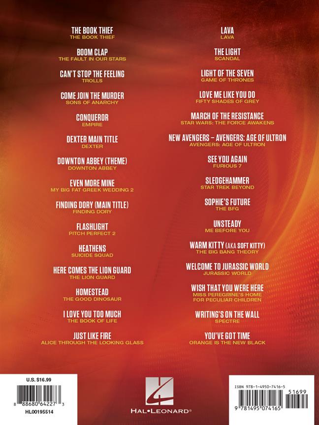 Hit TV and Movie Songs is a fantastic collection of 30 memorable songs from films and television series, arranged for Piano, Voice and Guitar. The songs and themes featured in this book include - The Book Thief - Can't Stop the Feeling (Trolls) - Dexter - Downton Abbey - Finding Dory - Heathens (Suicide Squad) - Light of the Seven (Game of Thrones) - Love Me like You Do (Fifty Shades of Grey) - March of the Resistance (Star Wars: The Force Awakens) - See You Again (Furious 7) - Warm Kitty (The Big Band Theory) - Writing's on the Wall (Spectre) - You've Got Time (Orange Is the New Black) and plenty more.