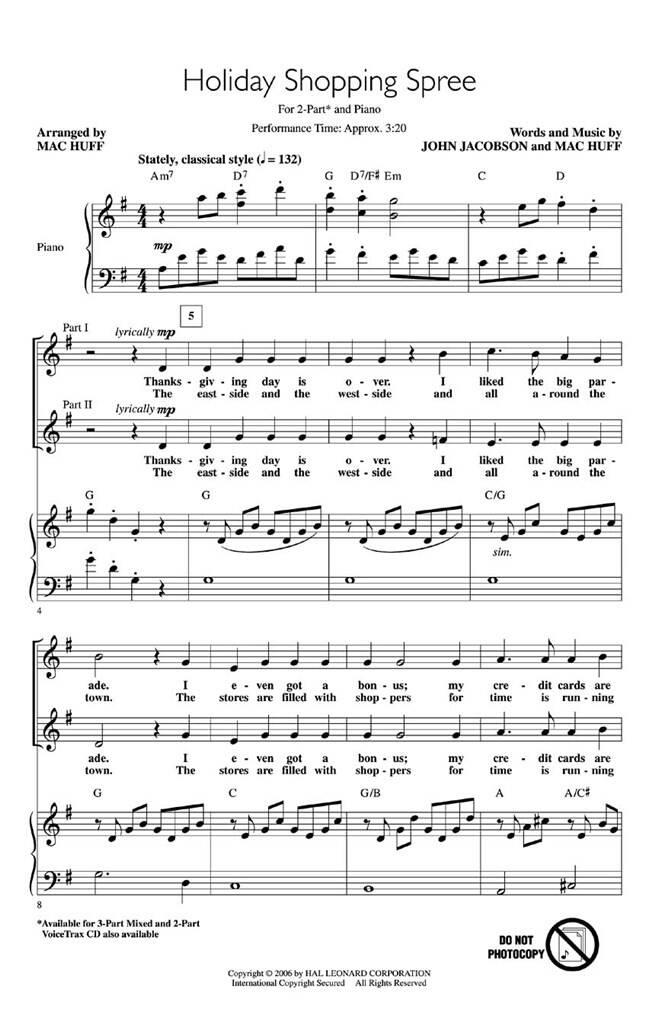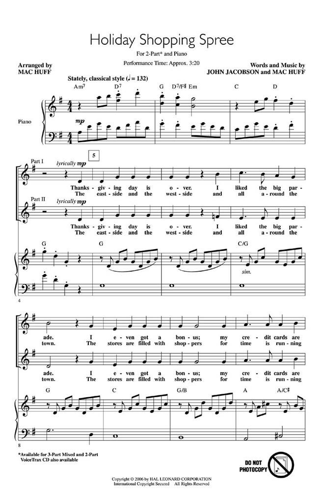 Il est 5h00 du matin, le lendemain de Thanksgiving, et tout le monde fait la queue, prêt à se ruer dans les magasins pour le début traditionnel de la saison des achats ! Cette sélection amusante de changement de rythme sera un ajout fantastique à vos programmes de vacances. Durée de représentation : Environ 3:20. Disponibles séparément : 2 parties, mixé en 3 parties et CD VoiceTrax.