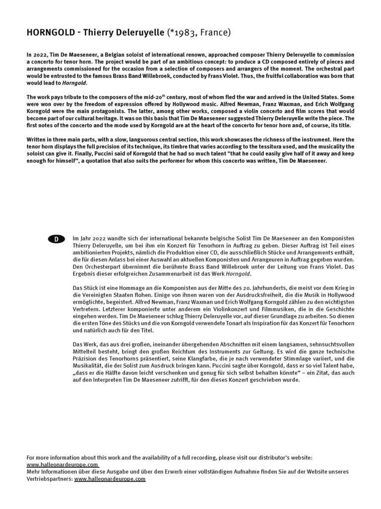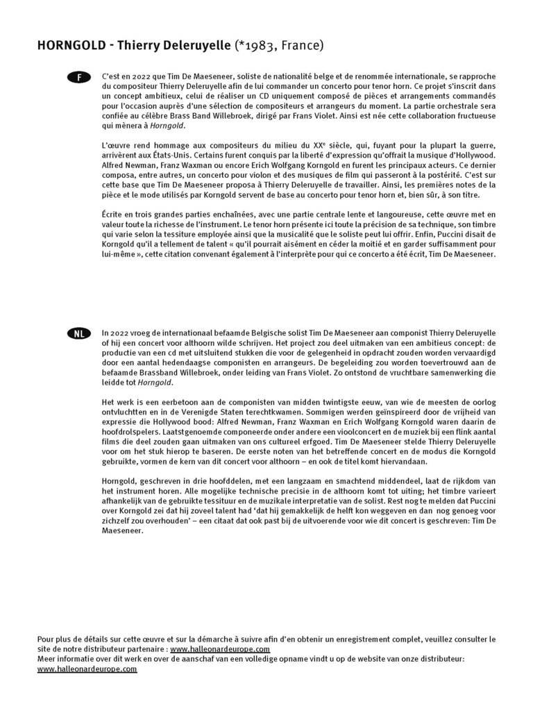 En 2022, le soliste belge de renommée internationale Tim De Maeseneer a approché le compositeur Thierry Deleruyelle pour écrire un concerto pour cor ténor. Faisant partie d’un CD composé entièrement d’œuvres commandées à une sélection de compositeurs et d’arrangeurs de l’époque, cette pièce rend hommage aux compositeurs du milieu du XXe siècle.