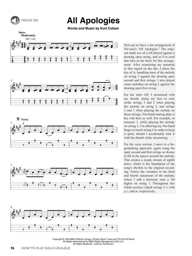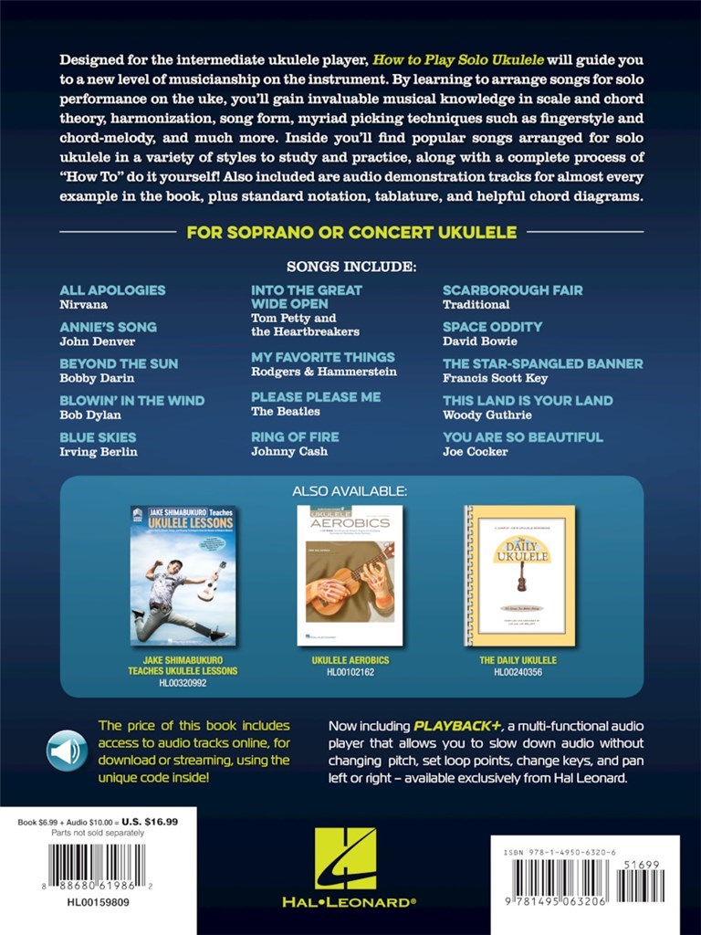 Conçu pour le joueur de ukulélé intermédiaire, ce livre vous guidera vers un nouveau niveau de musicalité sur cet instrument. En apprenant à arranger des chansons pour une performance solo au ukulélé, vous acquerrez des connaissances musicales inestimables sur la théorie des échelles et des accords, l’harmonisation, la forme des chansons, de nombreuses techniques de picking telles que le fingerstyle et la mélodie d’accords, et bien plus encore. À l’intérieur, vous trouverez des chansons populaires arrangées pour ukulélé solo dans une variété de styles à étudier et pratiquer, ainsi qu’un processus complet de Comment le faire soi-même ! Sont également inclus des pistes audio de démonstration pour presque tous les exemples du livre, ainsi que la notation standard, la tablature et des diagrammes d’accords utiles. Les chansons incluent : AllApologies · La Chanson d’Annie · Au-delà de la mer · Soufflant dans le vent · Ciel bleu · Vers la grande ouverte · Mes choses préférées · S’il vous plaît, plaisez-moi · Anneau de feu · Foire de Scarborough · Anomalie spatiale · La bannière étoilée · Cette terre est votre terre · Tu es si beau.