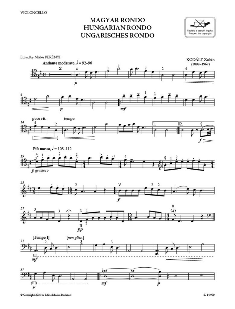 Hungarian Rondo was composed by Zoltán Kodály in December 1917, drawing on material from the incidental music he had written for Zsigmond Móriczs play Pacsirtaszó (Skylarking). The rondo form is shaped out of four new-style Hungarian folk songs and an instrumental dance melody. Kodály prepared the piece in two somewhat different versions, one for two clarinets, two bassoons and string orchestra, and the other for cello and piano. The orchestral version received its first performance in Vienna on 12 January 1918 at a "historical concert" organized by the War Ministry of the Austro-Hungarian Monarchy. The cello version was premi?red by Miklós Zsámboky and Ottó Herz at the Budapest Academy of Music on 4 November 1927. Neither version appeared in print in the composers lifetime. The version for string orchestra was edited in 1976 by Ferenc Farkas and István Máriássy (and is distributed as a hire material under the order number K-1). The cello version appears here in print for the first time. The publication is based on the composers surviving manuscript and a contemporary manuscript copy of this. The fingerings are by the editor.