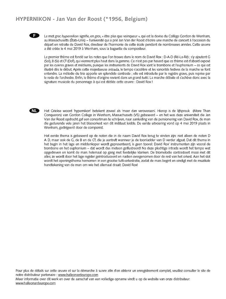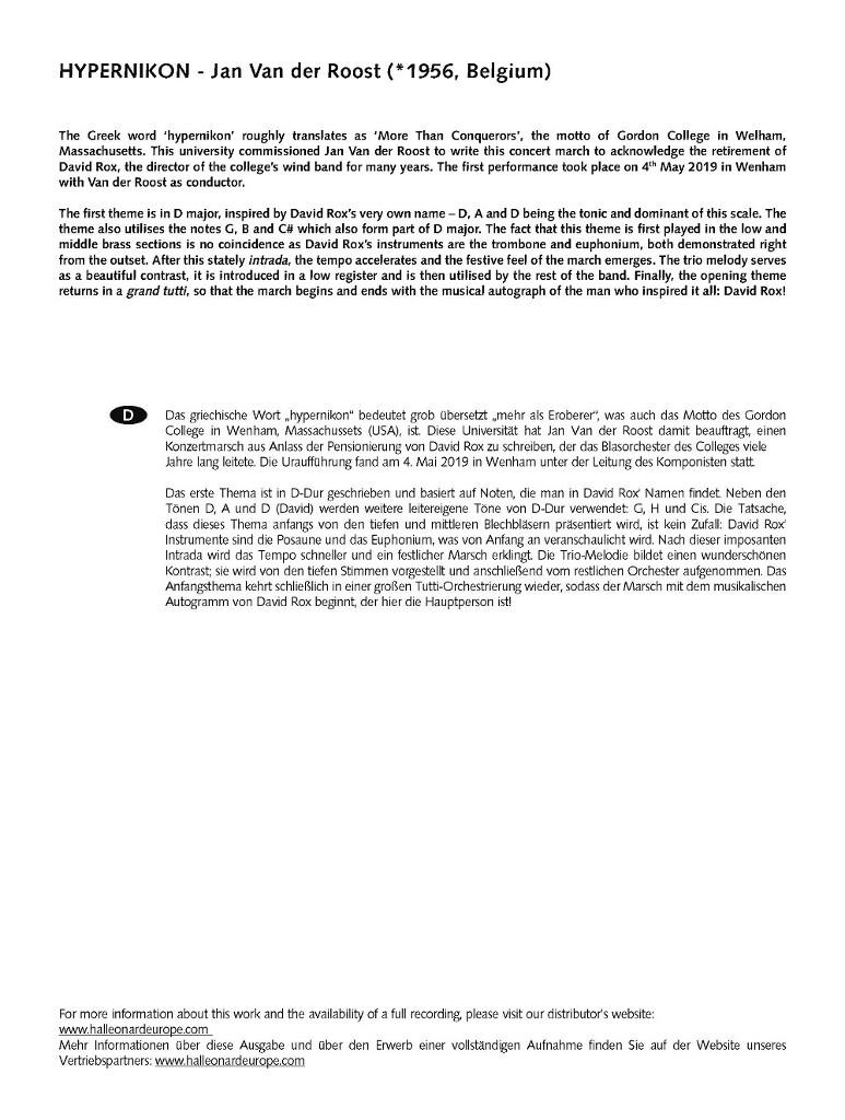 Le mot grec hypernikon signifie, en gros, « être plus que vainqueur », qui est la devise du commanditaire, le Collège Gordon de Wenham, au Massachusetts (États-Unis). Le premier thème est fondé sur les notes que l’on trouve dans le nom de David Rox. Après cette majestueuse intrada, le tempo s’accélère et les sonorités festives de la marche se font entendre. La mélodie du trio apporte un splendide contraste avant une conclusion qui reprend le thème d’origine dans un grand tutti.