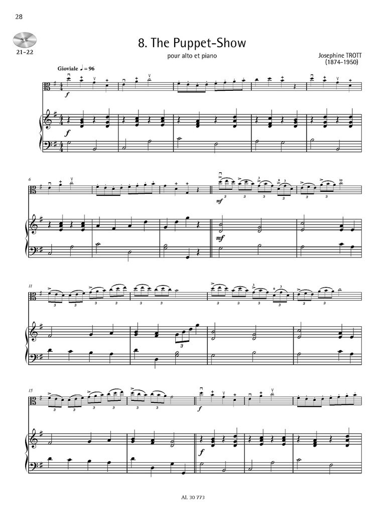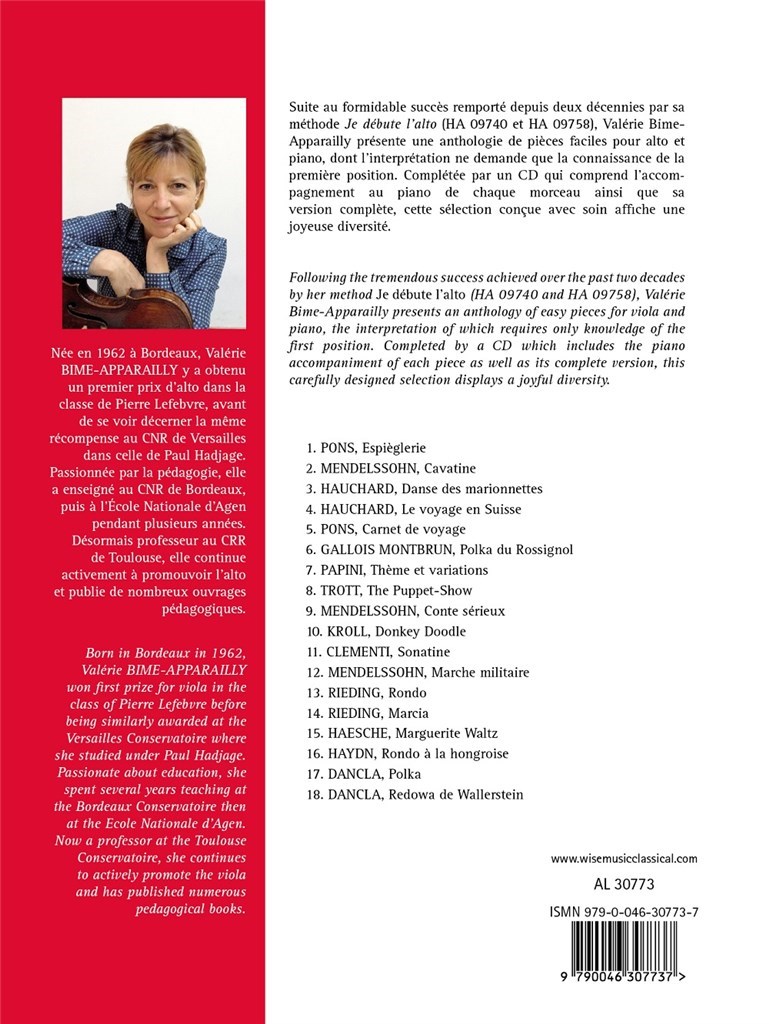 Following the tremendous success achieved over the past two decades by her method 'Je débute l’alto' (HA 09740 and HA 09758), Valérie Bime-Apparailly presents an anthology of easy pieces for viola and piano, the interpretation of which requires only knowledge of the first position. Completed by a CD which includes the piano accompaniment of each piece as well as its complete version, this carefully designed selection displays a joyful diversity.