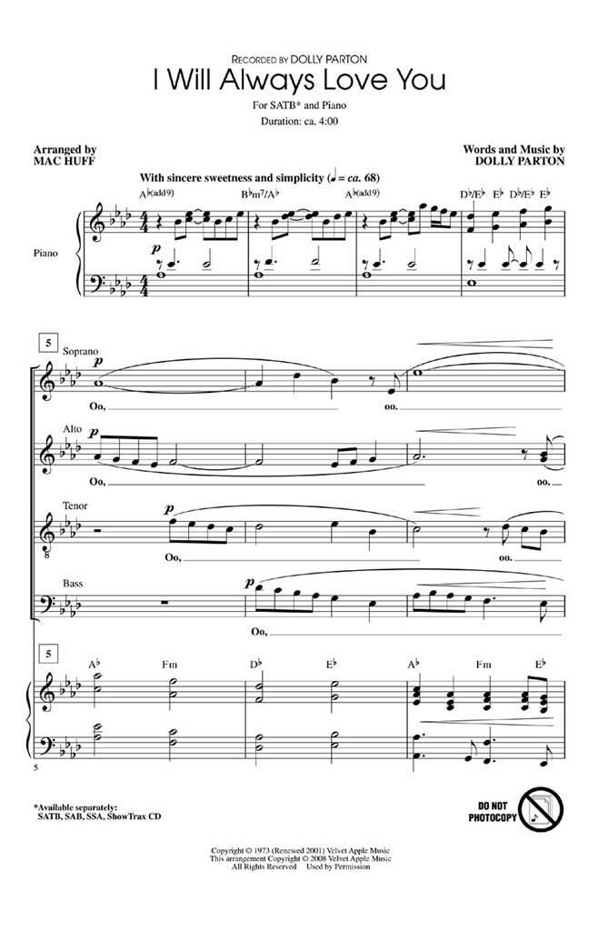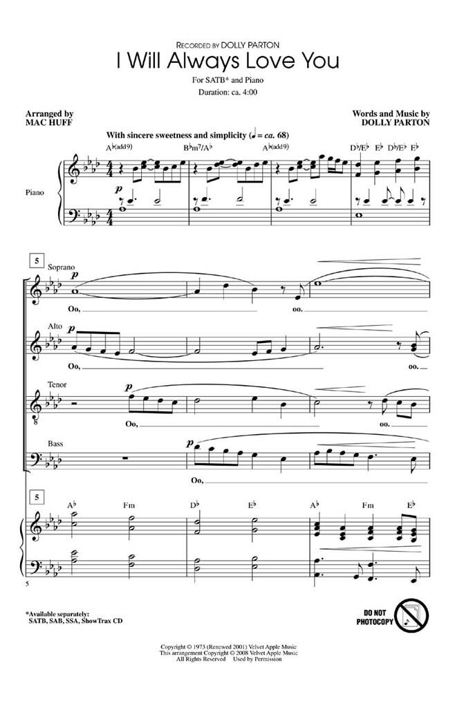 C’est la chanson qui a assuré la place de Dolly Parton dans l’histoire de la musique country et pop ! Simple, directe et puissante dans son impact émotionnel, cette sélection sera le point fort de tout programme. Disponibles séparément : SATB, SAB, SSA, ShowTrax CD. Durée : environ 16h00.