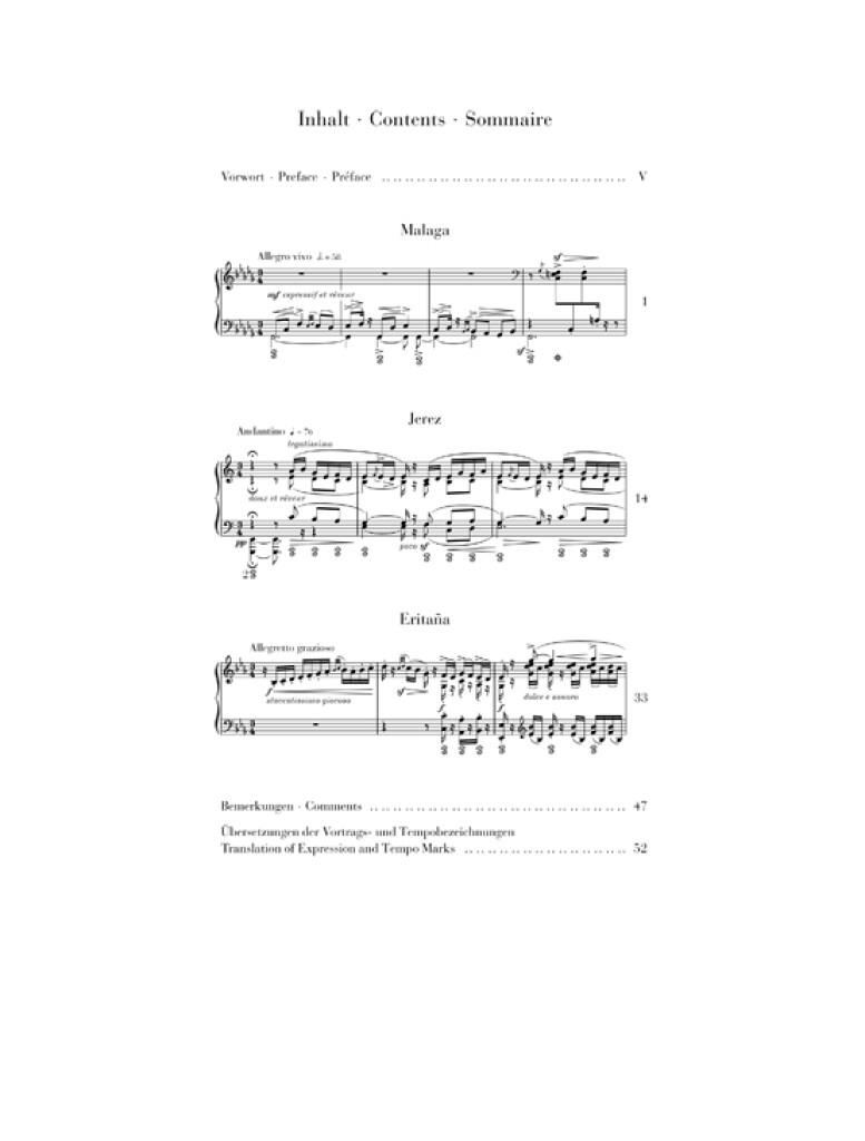 Ce quatrième et dernier volume de nos éditions Urtext bleues vient compléter le cycle «Iberia». Albéniz, marqué par la maladie, avait durement lutté pour l’achèvement de son oeuvre. Il réussit cependant à livrer la totalité des douze pièces promises à Joaquin Malats, un ami pianiste. Après les rythmes de danse sensuels de «Málaga» et le vif et enjoué «Eritaña», le compositeur réussit avec «Jerez» à tracer un portrait musical saisissant de la célèbre région viticole espagnole. «Jamais musique n’a atteint un caractère aussi divers, aussi coloré»se prononce le grand Debussy lorsqu’il découvre ce chef-d´oeuvre du romantisme tardif d’Albéniz.