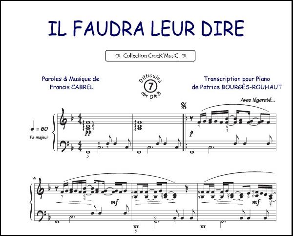 Il faudra leur dire - Cabrel, Francis (Collection CrocK'MusiC) Arrangement Piano - 2 + feuillet pour paroles - niveau : Moyen