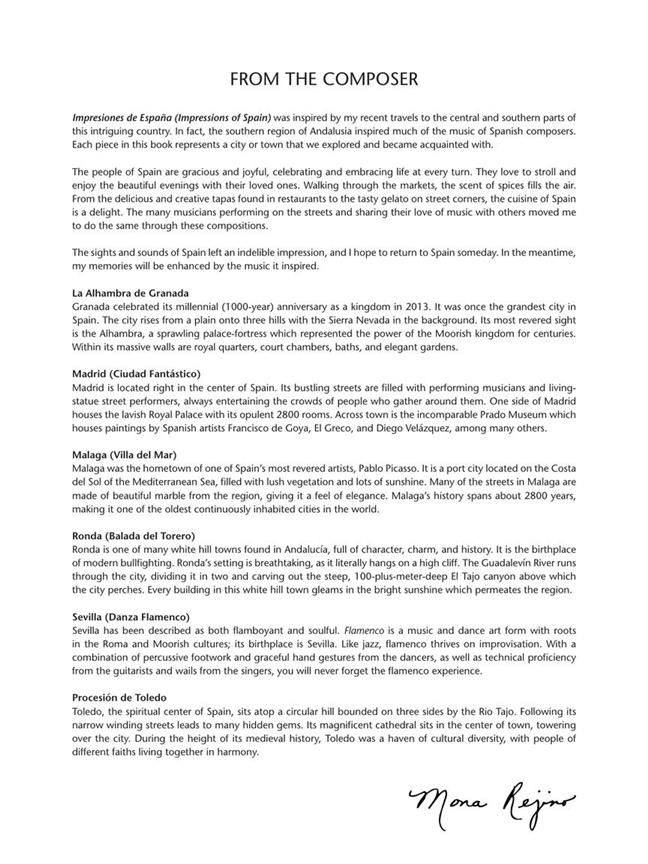 6 gorgeous piano solos inspired by a recent trip to Spain! Each title represents a city Mona explored and became fond of. The sights and sounds of the country are beautifully conveyed in each harmony and rhythmic motif.