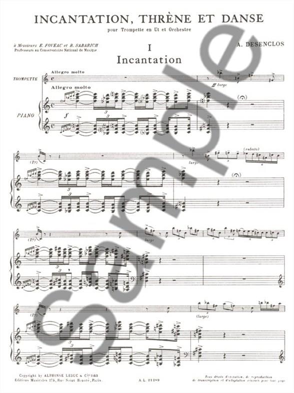 Incantation - Thrène Et Danse est une pièce écrite pour le concours du Conservatoire de Paris par Alfred Desenclos. Dédié à deux professeurs, E. Foveau et R. Sabarich. , cette pièce pour trompette et piano requiert des compétences, une technique et une endurance avancées. Écrite en trois parties, Incantation - Threne Et Danse, chaque partie commence d’abord par le piano, puis rejoint par la trompette. En termes de difficulté, les tonalités changent jusqu’à 4 dièses et 6 bémols, les rythmes et le tempo sont assez exigeants. Le niveau de difficulté est fixé à 8°. Alfred Desenclos (1912-1961) est un compositeur français qui a remporté le Prix de Rome en 1942. Il a également composé des messes telles que la « Messe de Requiem » et d’autres pièces, pour contrebasse, harpe, flûte, trompette et cor français.