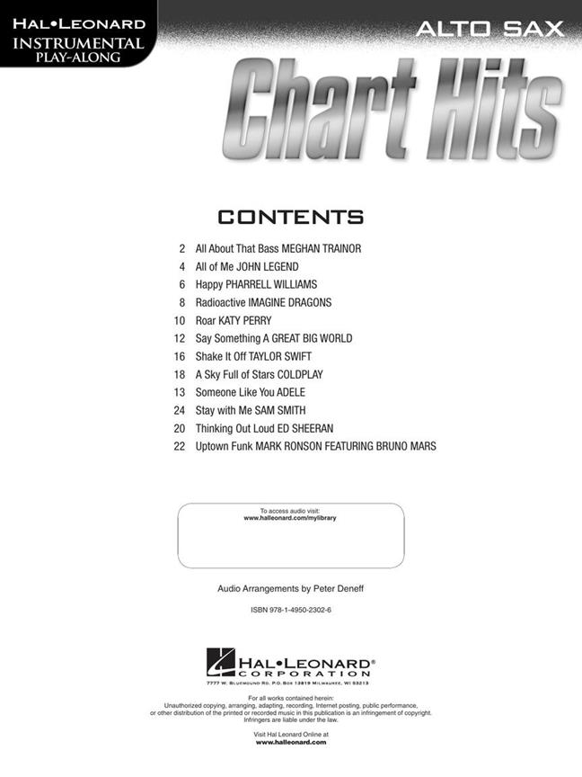 A dozen hot contemporary hits are included in this collection perfect for budding instrumentalists. Instrumental Play-Along Chart Hits comes complete with online access to audio demonstration tracks for download or streaming, helping you to hear how the songs should sound and allowing you to play along.