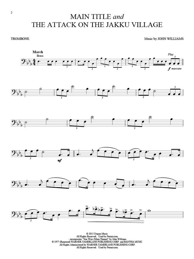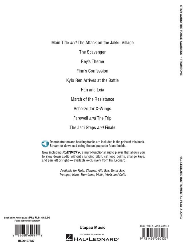 Arrangements solos de 10 titres célèbres du film. Le prix de ce livre inclut l’accès en ligne de versions audios de démonstration et d’accompagnement à télécharger qui permettent aux instrumentistes de ralentir le tempo sans changer de tonalité, derépéter des passages difficiles, et plus encore. Farewell and the Trip, Finns Confession, Han and Leia, The Jedi Steps and Finale, Kylo Ren Arrives at the Battle, Main Title and the Attack onthe Jakku Village, March of the Resistance, Reys Theme, The Scavenger, Scherzo for X-Wings.