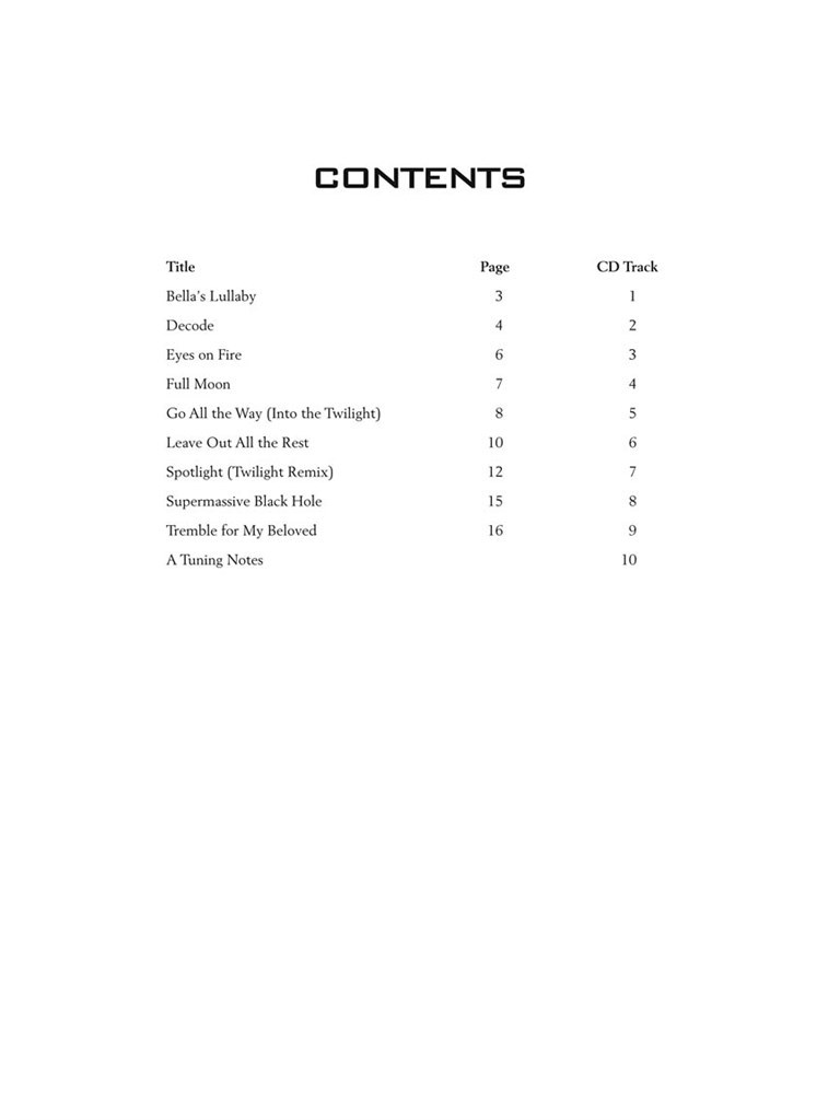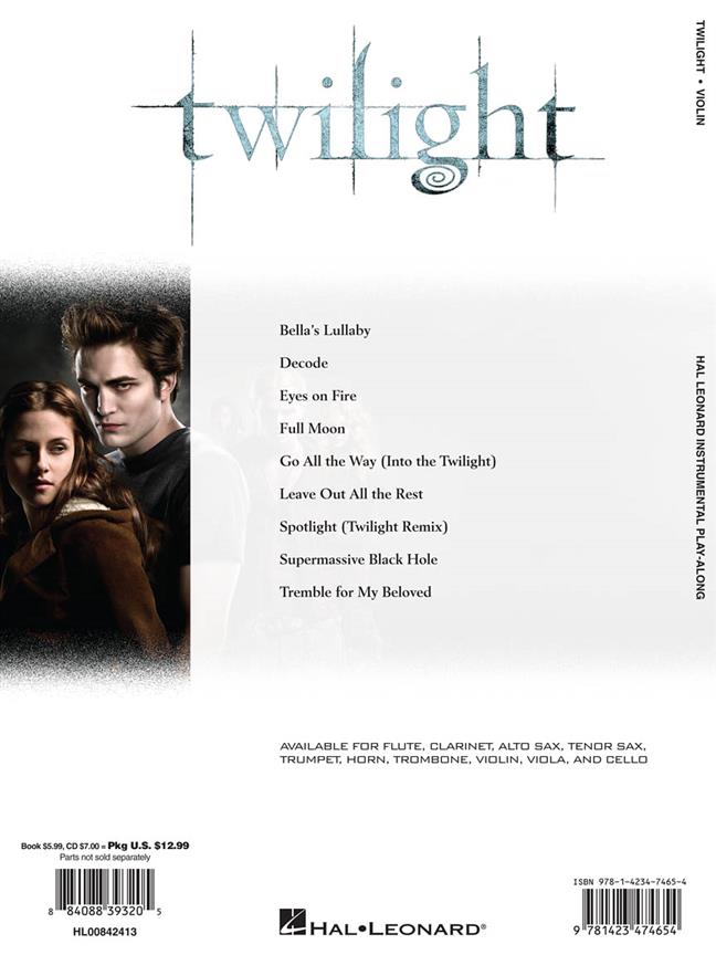 Partitions de 9 chansons tirées du film 'Twilight' spécialement arrangées pour violon solo. Inclus un CD avec pistes démos et pistes playback.