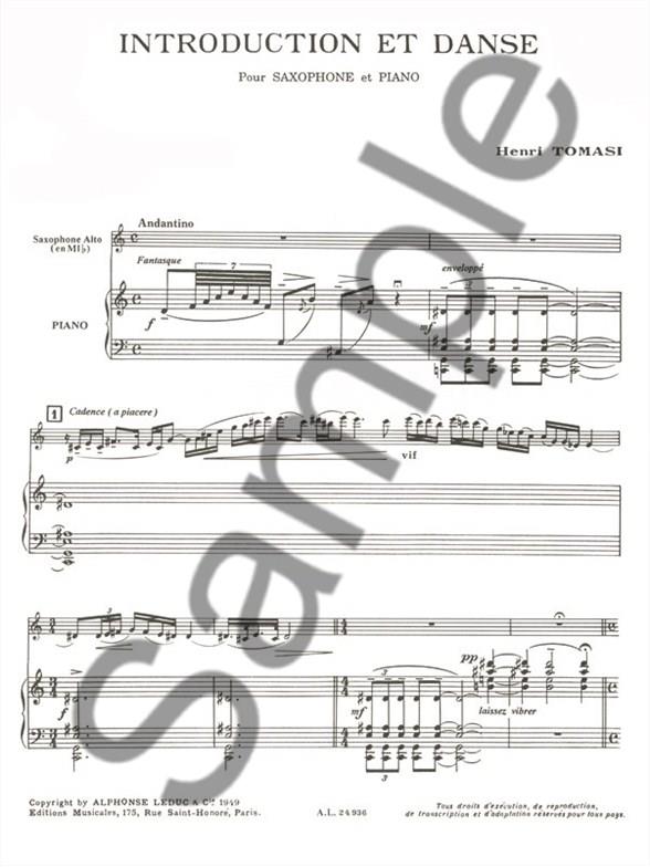A 1949 composition by French composer Henri Tomasi, Introduction et Danse is scored for Alto Saxophone with Piano accompaniment.