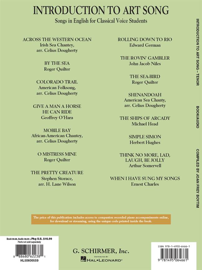 Joan Boytim a sélectionné certaines des chansons les plus faciles en anglais de la série The First Book of Solos et les a adaptées à un autre type de voix, rendant les chansons accessibles à plus d’élèves. De plus, d’autres chansons d’art américaines et britanniques appropriées ont été incluses. Avec 15 à 20 chansons par volume, chaque type de voix a une liste de chansons unique. Parfait pour les cours de chant, ainsi que pour les cours particuliers.