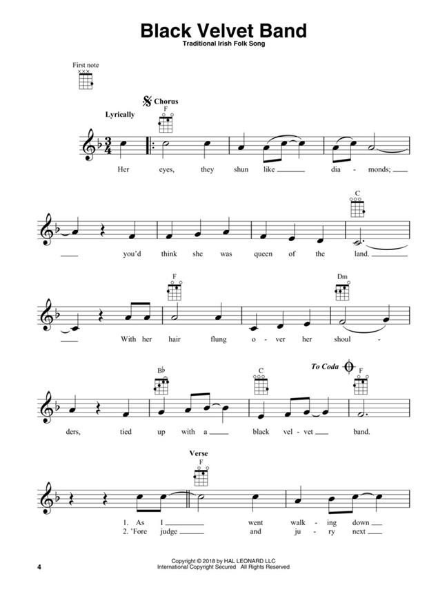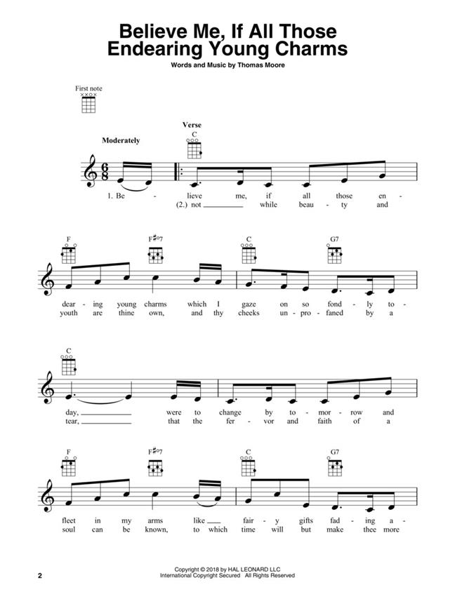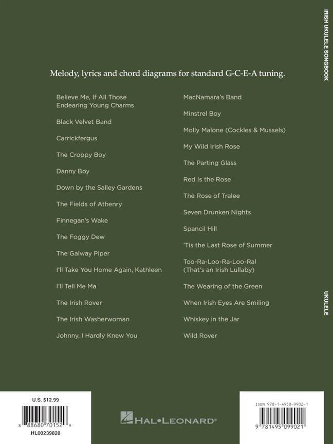 Melody, lyrics and chord diagrams for standard G-C-E-A tuning on 30 songs. Melody, lyrics and chord diagrams for standard G-C-E-A tuning on 30 traditional Irish songs, including: 'Believe Me, If All Those Endearing Young Charms', 'Carrickfergus', 'Danny Boy', 'Finnegan's Wake', 'The Galway Piper', 'The Irish Washerwoman', 'Molly Malone (Cockles and Mussels)', 'My Wild Irish Rose', 'Too-Ra-Loo-Ra-Loo-Ral (That's an Irish Lullaby)', 'The Wearing of the Green', 'When Irish Eyes Are Smiling' and more.