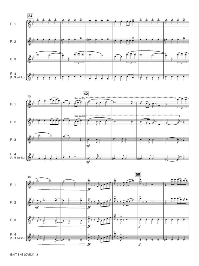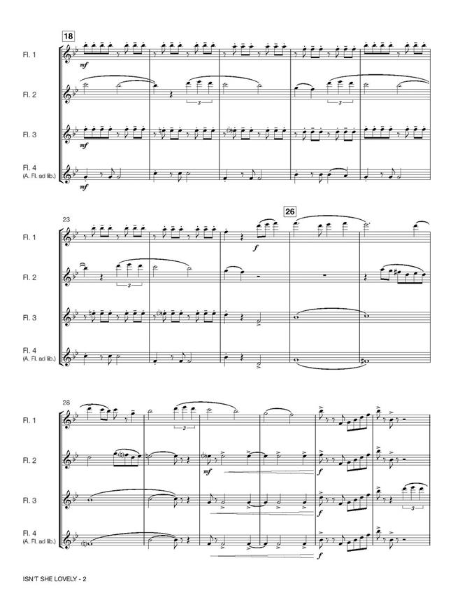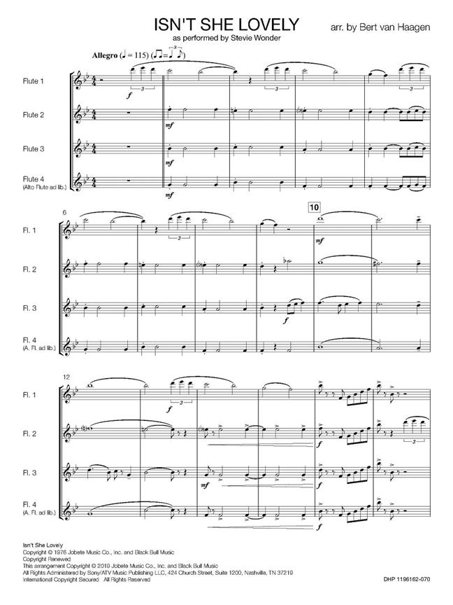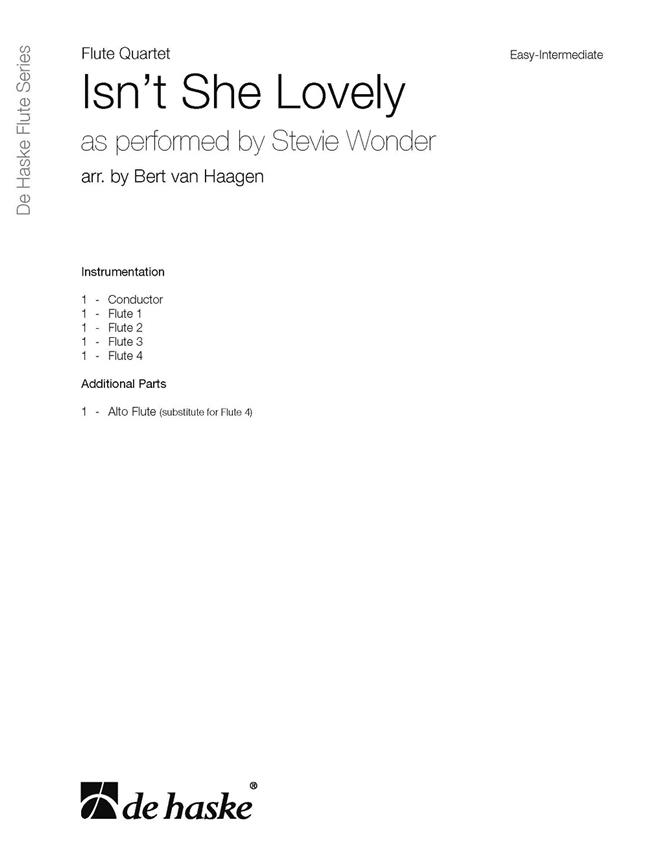 "Isn't She Lovely " est une chanson de Stevie Wonder tirée d'un album sorti en 1976, Songs in the Key of Life. Les paroles célèbrent la naissance de sa fille, Aisha Morris. Bert van Haagen a élaboré un arrangement facile pour quatuor de flûtes de cette très belle chanson.