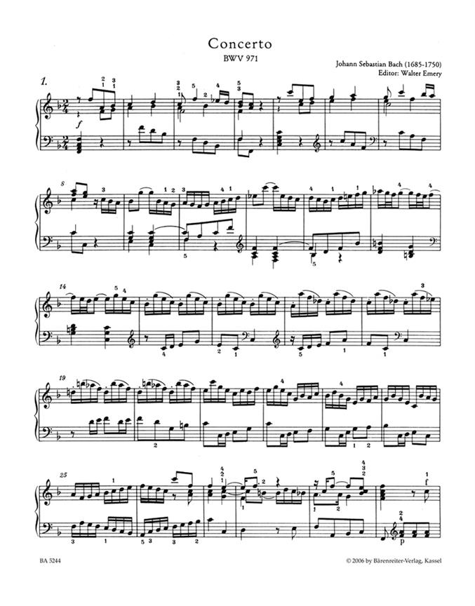 With fingerings by Renate Kretschmar-Fischer. The popular work known today as the Italian Concerto was published as Part 2 of Johann Sebastian Bach 's Clavier-ubung in 1735, together with the Overture in B minor (BWV 831). Publications of music were a rarity in those days, and it stands to reason that Bach would select only pieces he found superior and representative. Originally written for a two-manual Harpsichord, this music, with its terrace dynamics alternating between Piano and Forte, also reveals its full beauty when played on a modern piano, with the soloist vying with an imaginary orchestral tutti. Thisedition presents the Urtext of the New Bach Edition« at the cutting edge of Bach scholarship. The fingerings have been added by Renate Kretschmar-Fischer, an internationally renowned pianist and teacher, offering valuable suggestions for study and lessons. Rounding off this volume is an informative introduction discussing the work's genesis, source tradition as well as fingering on the modern Piano. Urtext edition without fingering available as BA5194.