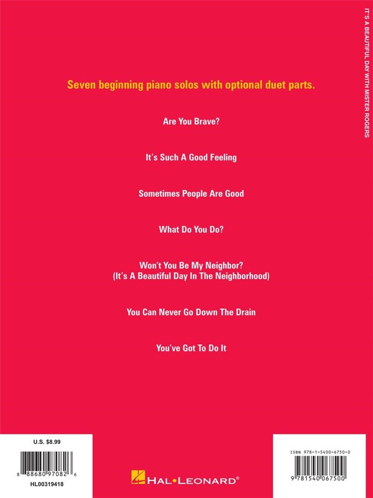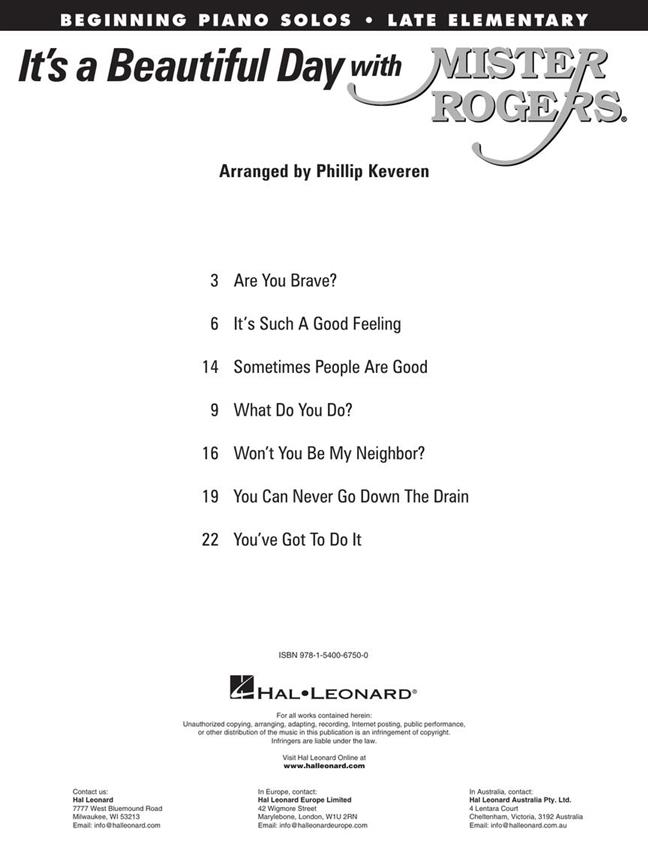 Now back in stock! The iconic television show and music from Mister Rogers Neighborhood is back in the spotlight with the November 2019 release of the A Beautiful Day in the Neighborhood movie starring Tom Hanks. This songbook includes 7 Phillip Keveren arrangements from the popular children's show: