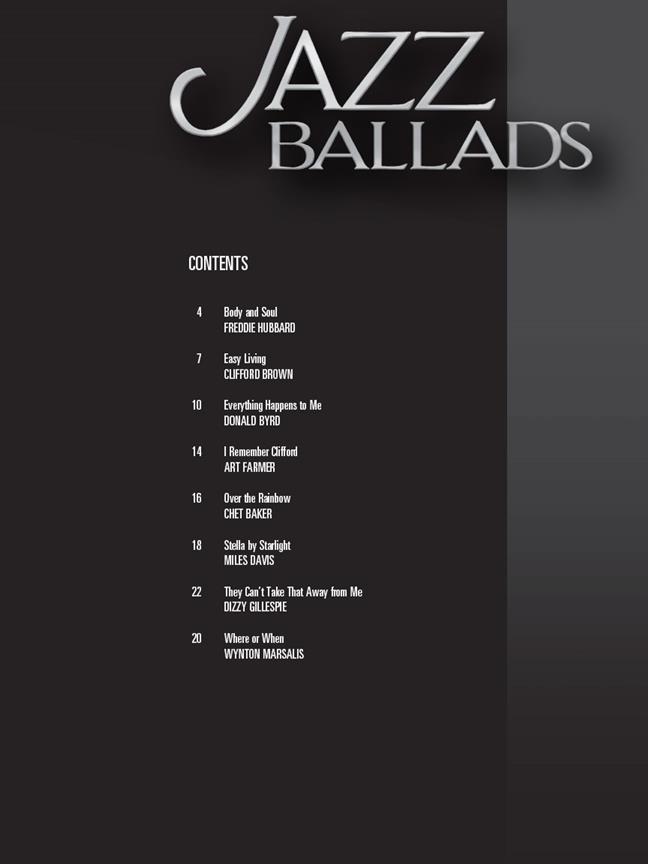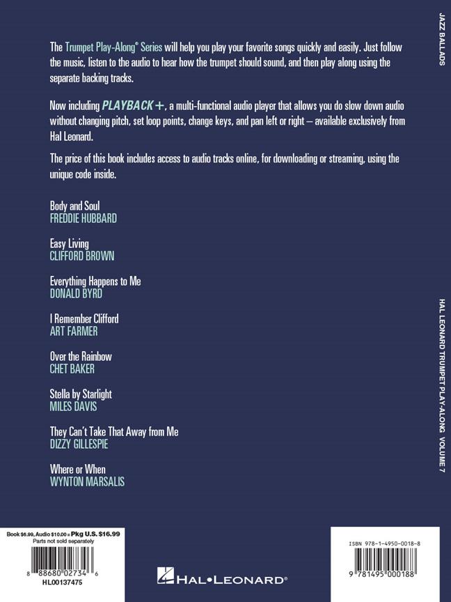 The Trumpet Play-Along Series will help you play your favorite songs quickly and easily. Just follow the printed music, listen to the sound-alike recordings and hear how the trumpet should sound, and then play along using the separate backing tracks. This volume includes 8 beautiful ballads: Body and Soul (Freddie Hubbard) - Easy Living (Clifford Brown) - Everything Happens to Me (Donald Byrd) - I Remember Clifford (Art Farmer) - Over the Rainbow (Chet Baker) - Stella by Starlight (Miles Davis) - They Can't Take That Away from Me (Dizzy Gillespie) - Where or When (Wynton Marsalis). Online audio is accessed at halleonard.com/mylibrary