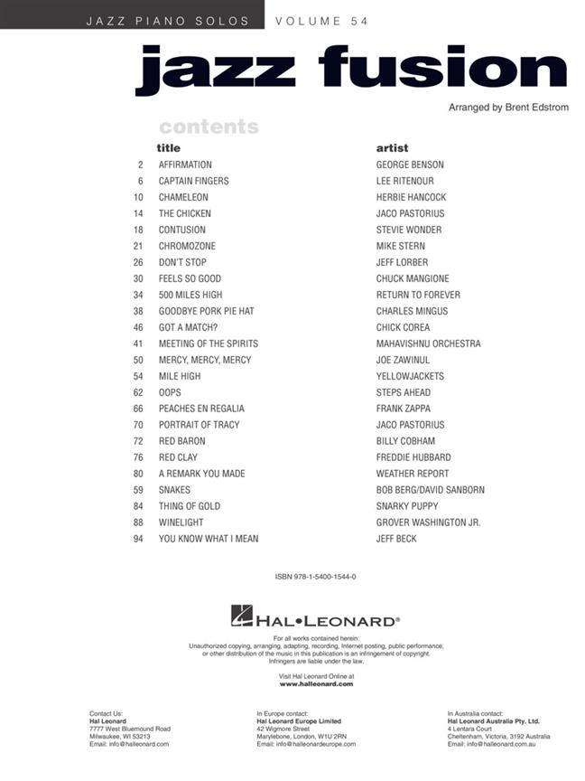 24 fusion favorites are included in this collection featuring piano solo arrangements with chord names. Includes: Chameleoù (Herbie Hancock) · don' t Stoù (Jeff Lorber) · Feels So good (Chuck Mangione) · 500 Miles High (Return toForever) · Goodbye Pork Pie Hat (Charles Mingus) · mercy, mercy, mercy (Joù Zawinul) · Peaches en Regalia (Frank Zappa) · Portrait où Tracy (Jaco Pastorius) · A Remark you Made (Weather Report) · you Knos What I mean (Jeff Beck) ·and more.