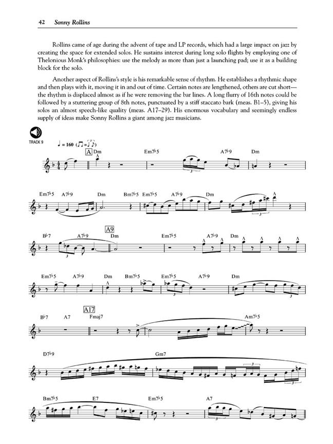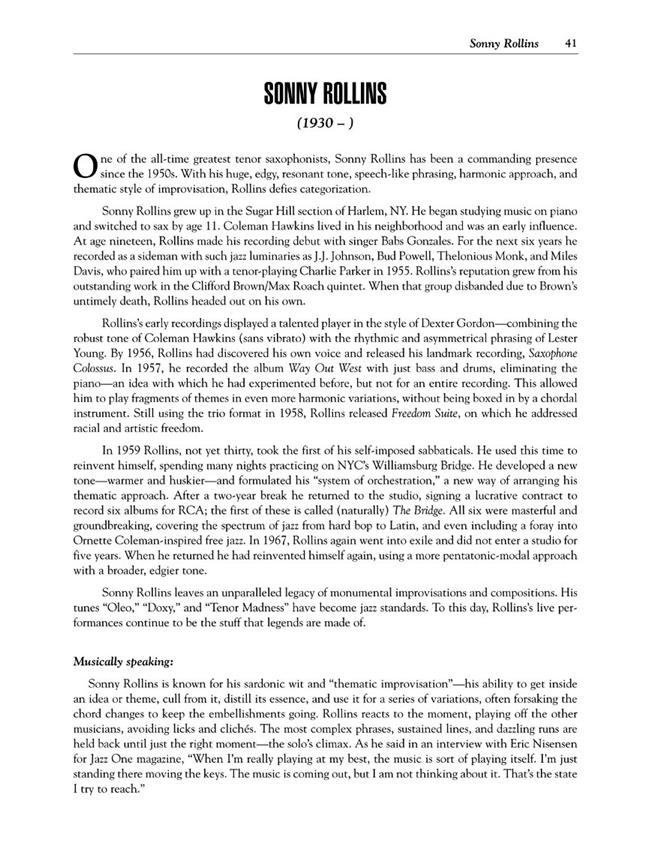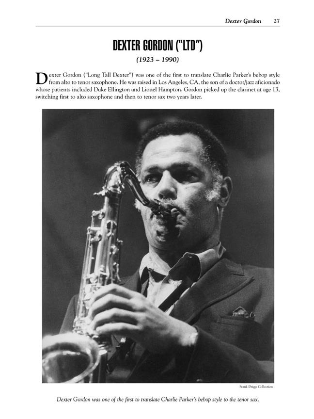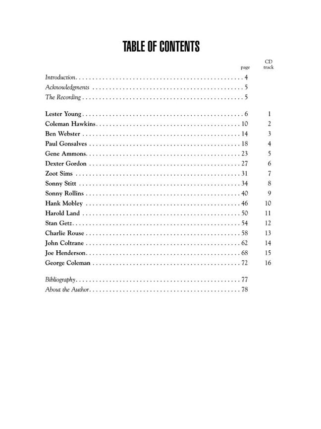 Ce pack de livre/CD est consacré uniquement à vous offrir un aperçu complet des techniques et styles popularisés par les plus grands saxophonistes ténor de tous les temps. Tous les meilleurs sont ici : depuis les excursions cool bebop de Dexter Gordon, aux rêveries stellaires de John Coltrane, avec plus d'une douzaine de joueurs maîtres examinés entre les deux. Inclut des leçons, musique, analyse historique et photos rares, plus un CD avec 16 pistes pleine bande ! La 16 pièces dans ce livre sont chaque dans le style de sur de la suit artistes : Lester Young - Coleman Hawkins - Ben Webster - Paul Gonsalves - Gene Ammons - Dexter Gordon - Zoot Sims - Sonny Stitt - Sonny Rollins - Hank Mobley - Harold Land - Stan Getz - Charlie Rouse - John Coltrane - Joe Henderson - et George Coleman