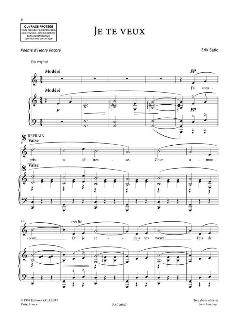La revue de café-concert (ou caf’conc’) était l’une des formes de divertissement populaire à Paris depuis la moitié du XIXe siècle et au début du XXe. Les programmes étaient composés de piécettes en un acte, d’airs d’opéra, de tours de chant, de danse, de numéros de cirque, etc. Dans le répertoire d’une soirée de café-concert, il y avait la valse chantée, sentimentale et très mélodique, sur des paroles racées ; Je te veux en constitue un exemple. Dans cette édition, la version originale pour voix élevée de cette célèbre valse.
