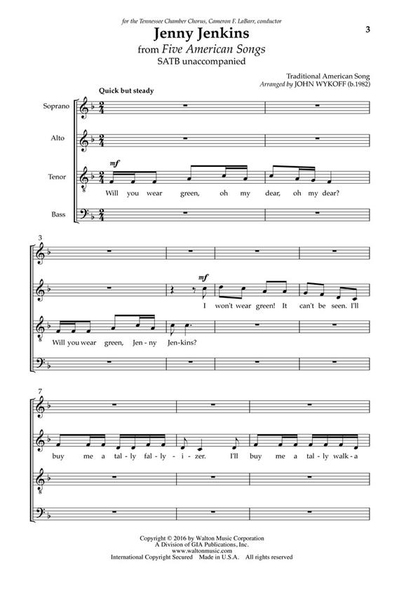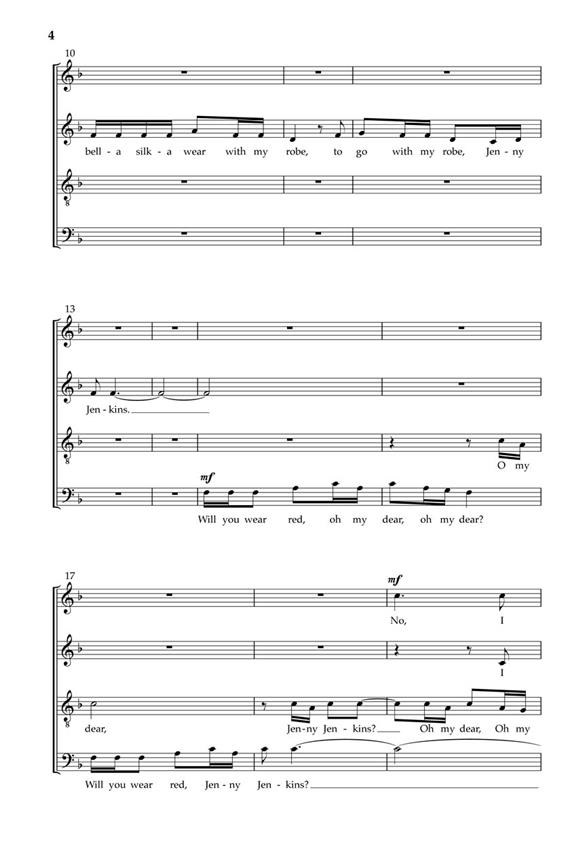 A game in song. The arranger has captured the back and forth bounce of the song-game as the question "What will you wear, Jenny Jenkins?” flits from part to part. Jenny's ultimate answer will likely solicit a few chuckles. From the Amanda Quist Choral Series.