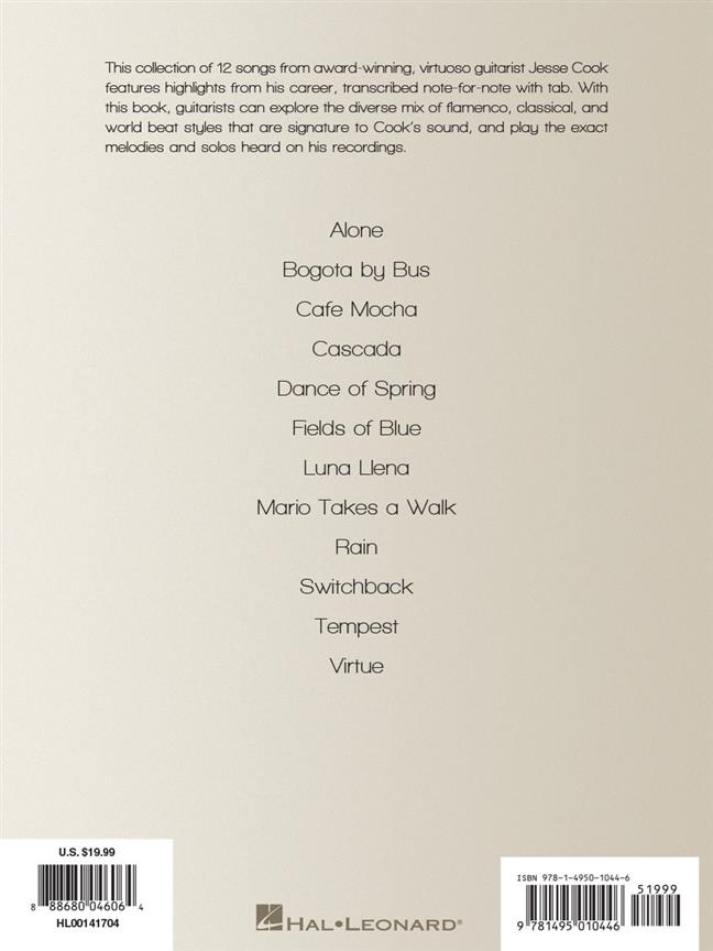 This collection of 12 songs from award-winning, virtuoso guitarist Jesse Cook features highlights from his career transcribed note for note with tab. With this book, guitarists can explore the diverse mix of flamenco, classical, and world beat styles that are signature to Cook's sound, and play the exact melodies and solos heard on his recordings. Titles include: Alone - Bogota by Bus - Cafe Mocha - Cascada - Dance of Spring - Fields of Blue - Luna Llena - Mario Takes a Walk - Rain - Switchback - Tempest - Virtue.
