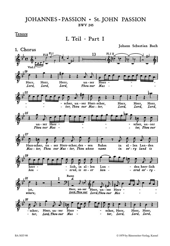 La Passion selon saint Jean fut jouée pour la première fois à Leipzig le Vendredi saint 1724. Écrite trois ans avant la Passion selon saint Matthieu, c’était une œuvre que Bach a révisée tout au long de sa vie, en fait il ne nous a pas laissé de version définitive, ni imprimée ni en copie de qualité. Les sources évoquent quatre versions différentes utilisées lors de quatre représentations – 1724, 1725, vers 1730 et durant les dernières années de la vie de Bach. Ils contiennent souvent deux lectures ou plus pour le même passage, voire des mouvements différents qui, à différentes occasions, occupaient la même place dans l’œuvre. L’édition de Barenreiter utilise la version finale IV comme base, avec des mouvements et lectures alternatifs contenus dans les annexes. Une préface complète dans le score de l’étude (allemand/anglais) TP197 fournit des informations complètes. - Partition complète, matériel de performance (BA5037), partition vocale (BA5037-90) et score d’étude (TP197) disponibles à la vente.