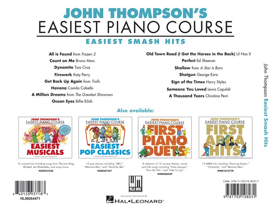 John Thompson’s timeless approach to teaching has been trusted by generations of teachers to start millions of students on their musical journey. Featuring popular smash hits, this book includes 15 repertoire pieces to complement the Easiest Piano Course, helping to reinforce basic technique, develop musicality and increase the enjoyment of learning. Includes smash hits by Ed Sheeran, Lady Gaga, George Ezra, Billie Eilish, and Camila Cabello.