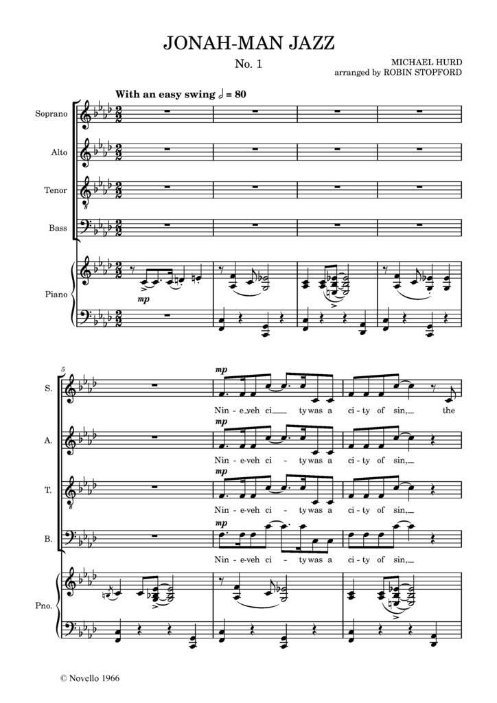 Michael Hurd’s 1966 tune Jonah-Man Jazz tells the story of Jonah’s flight from Nineveh, his defiance of God’s wishes and his brush with the Whale. This arrangement by Robin Stopford is for SATB and piano.