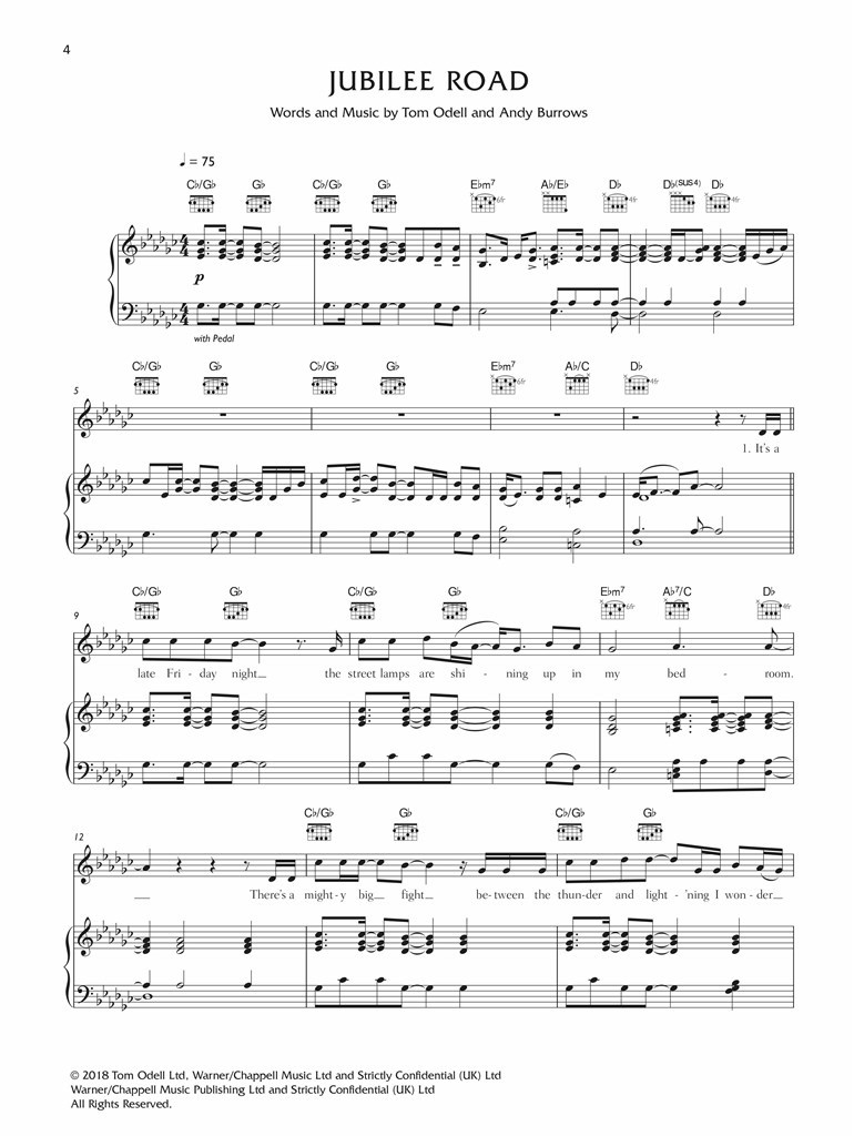 Jubilee Road is English singer-songwriter Tom Odell's third studio album. This artist-approved songbook contains piano and vocal transcriptions of all songs from the album, plus guitar chords.