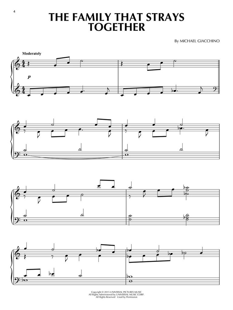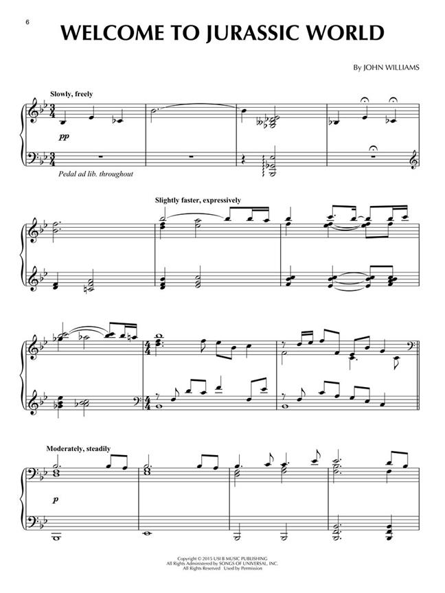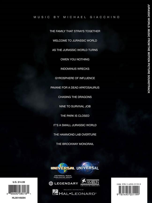 Des arrangements pour piano en solo sont inclus pour : The Family That Strays Together, Welcome to Jurassic World, As the Jurassic World Turns, Owen You Nothing, Indominus Wrecks, Gyrosphere of Influence, Pavana for a Dead Apatosaurus, Chasing the Dragons, Nine to Survival Job, The Park Is Closed, It’s a Small Jurassic World, The Hammond Lab Overture, The Brockway Monorail.