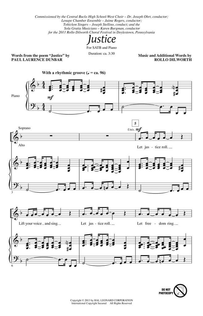 Utilisant le refrain des droits civiques Let justice roll et un poème de Paul Laurence Dunbar, cette œuvre est à la fois inspirante et instructive. Mise dans un groove rythmique, l’œuvre monte en un puissant chœur gospel avec un mélisme harmonisé sur le roulement de mots, comme pour symboliser la propagation de la justice à travers le pays. Idéal pour les concerts MLK, les événements communautaires et tous types de concerts.