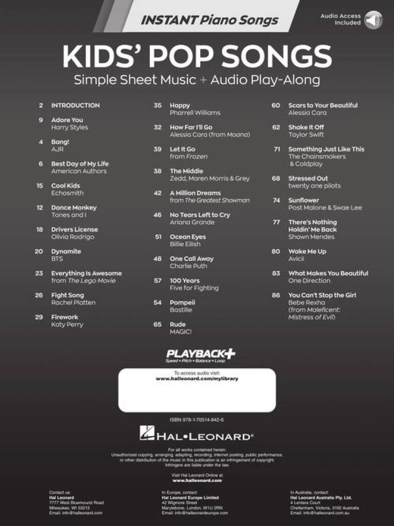 The Instant Piano Songs series will help you play your favorite songs quickly and easily - whether you use one hand or two! Start with the melody in your right hand, then add basic left-hand chords when you're ready. Letter names inside each note speed up the learning process, and optional rhythm patterns take your playing to the next level. Online backing tracks are also included. Stream or download the tracks using the unique codes inside each book, then play along to build confidence and sound like a pro! This edition includes 30 contemporary hits kids love to play and sing, including: Adore You · Cool Kids · Drivers License · How Far I'll Go · A Million Dreams · Ocean Eyes · Shake It Off · What Makes You Beautiful · and more.