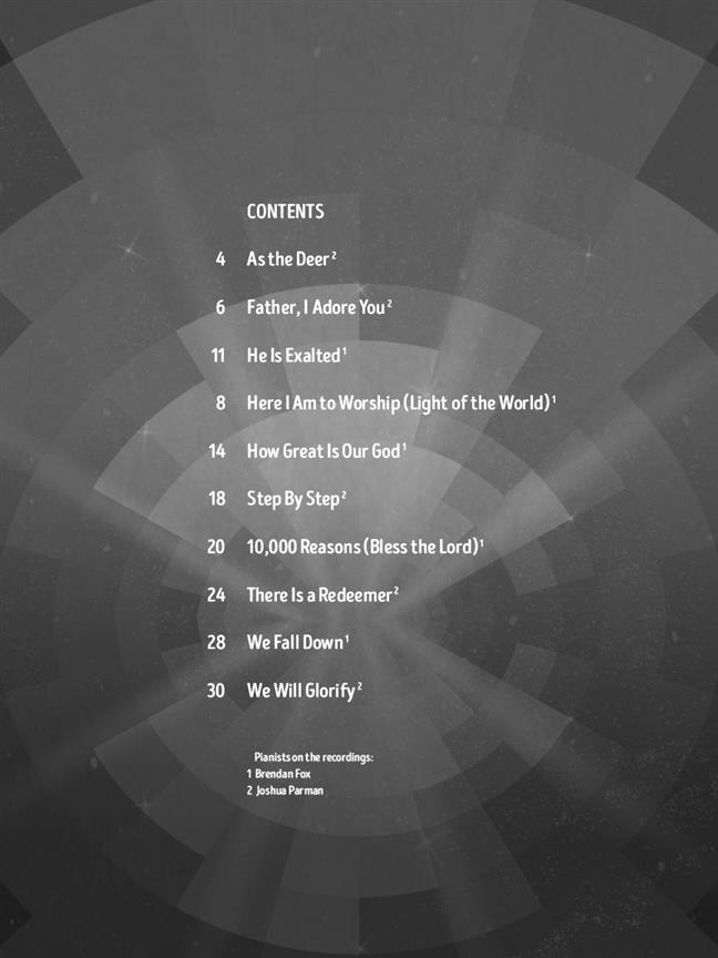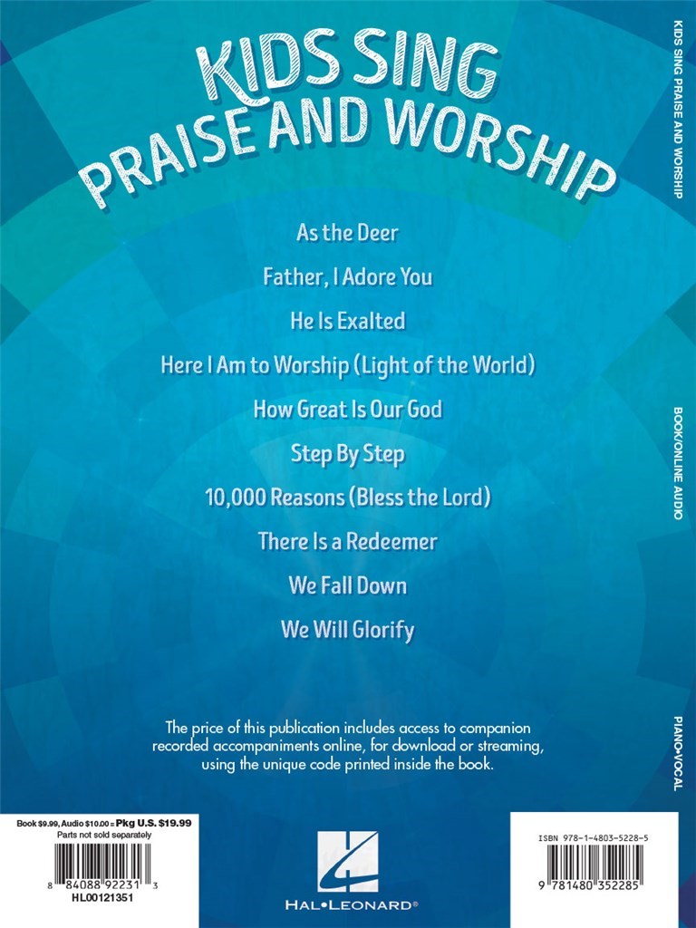Ten contemporary Christian songs specifically chosen for kids. In addition to a book of vocal arrangements with piano accompaniments, this package also includes recordings of the piano accompaniments - perfect for practice OR performance. Includes: As the Deer · Father I Adore You · He Is Exalted · Here I Am to Worship Light of the World · How Great Is Our God · Step by Step · 10,000 Reasons (Bless the Lord) · There Is a Redeemer · We Fall Down · We Will Glorify.
