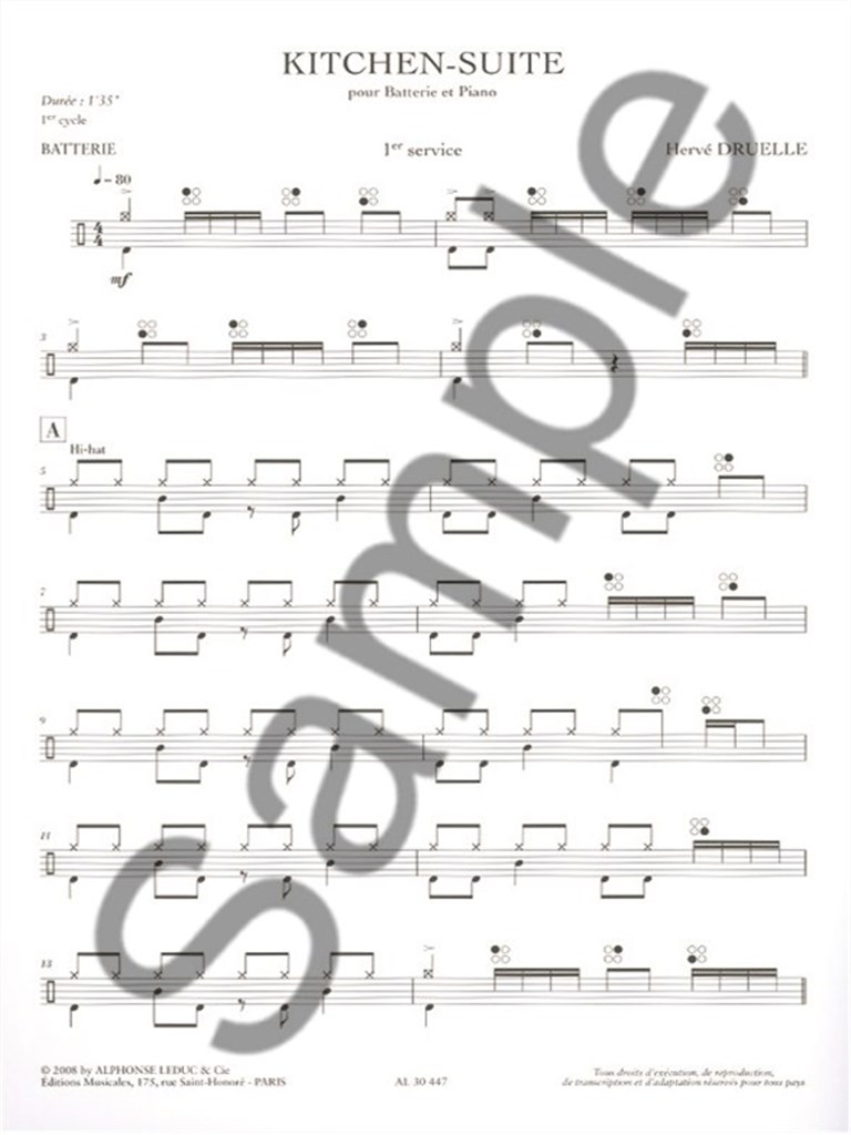 Kitchen suite (cycle 1) (1'35'') pour batterie et piano. Par Druelle aux editions Leduc. Partition / Livre de chansons pour Batterie