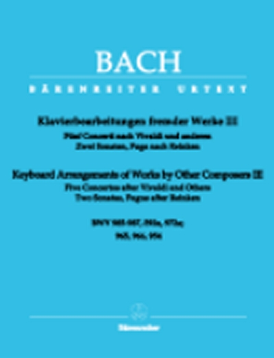 About Keyboard Arrangements Of Works By Other Composers, Volume III(Five Concertos After Vivaldi And Others / Two Sonatas, Fugue After Reinken) By Johann Sebastian Bach (1685-1750), edited by Karl Heller. Collection for solo piano (or harpsichord). Urtext of the New Bach Edition. 77 pages. Published by Baerenreiter-Ausgaben (German import). (BA. BA5223) ISBN M006505425. With introductory text (does not include words to the songs). Baroque. 9x12 inches. Contents:Concerto In G Minor, BWV 985 composed by Georg Philipp Telemann, from TVW 51: g 1. Concerto In G Major, BWV 986 composed by unknownConcerto In D Minor, BWV 987 composed by Jonhann Ernst Prinz von Sachsen-Weimar, from Op. 1, No. 4. Concerto In G Major, BWV 592a composed by Jonhann Ernst Prinz von Sachsen-WeimarAppendix: Concerto In D Major, BWV 972a composed by Antonio VivaldiSonata In A Minor, BWV 965 composed by Johann Adam Reinkens, from 'Hortus Musicus' - 1687. Sonata In C Major, BWV 966 composed by Johann Adam Reinkens, from 'Hortus Musicus' - 1687. Fugue In Bb Major, BWV 954 composed by Johann Adam Reinkens, from 'Sonata Sexta'.