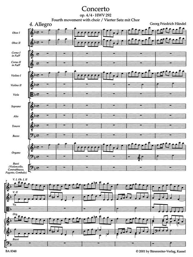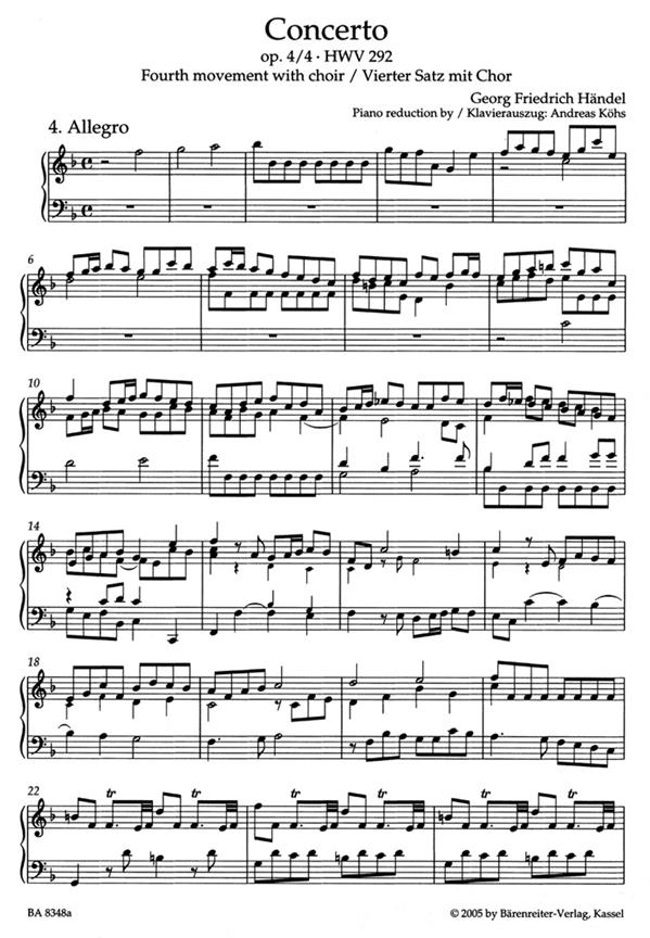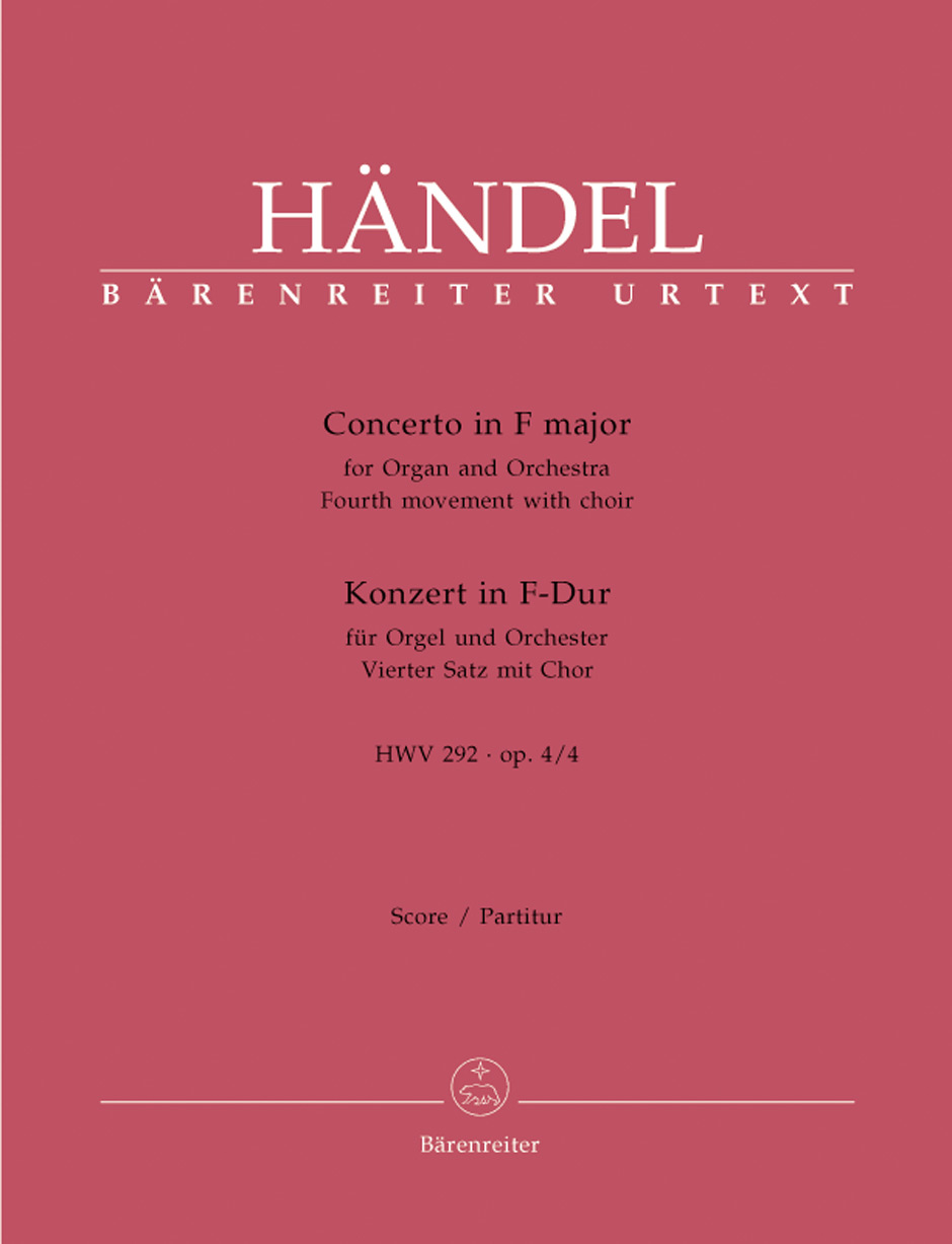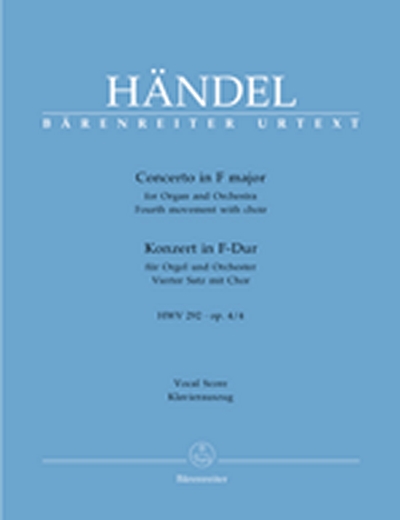 Unlike Handel ’s other Organ concertos, HWV 292 is not a transcription of a work for a different solo instrument, but was conceived from the outset as part of the oratorio Athalia. Its fourth movement leads seamlessly into a Hallelujah chorus that was only later replaced by an Adagio ending for publication purposes. Thanks to the relative simplicity of the chorus, our volume makes a useful addition to the material already published for this concerto (BA 8344). Original version of movement no. 4 from Organ Concerto HWV 292. Effective and easy to perform. For four-voice mixed chorus.