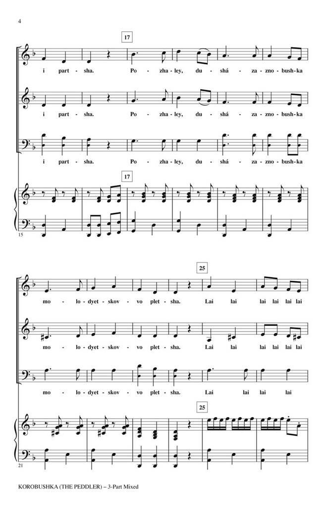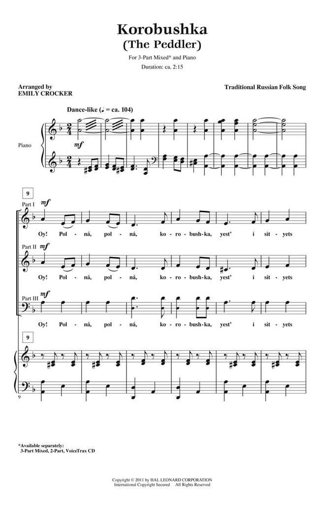Cette célèbre chanson folklorique russe raconte l’histoire d’un colporteur et d’une fille dans un cadre dynamique que vos chanteurs en devenir adoreront chanter ! Les deux échangent des plaisanteries, alternant avec un interlude vocal dansant. Après une pause, la musique accélère progressivement jusqu’au dernier « Hey ! » haletant. Inclut des paroles en russe et en anglais, accompagnées d’un guide de prononciation. Disponible séparément : mixé en 3 parties, CD VoiceTrax en 2 parties. Durée : environ 2:15.