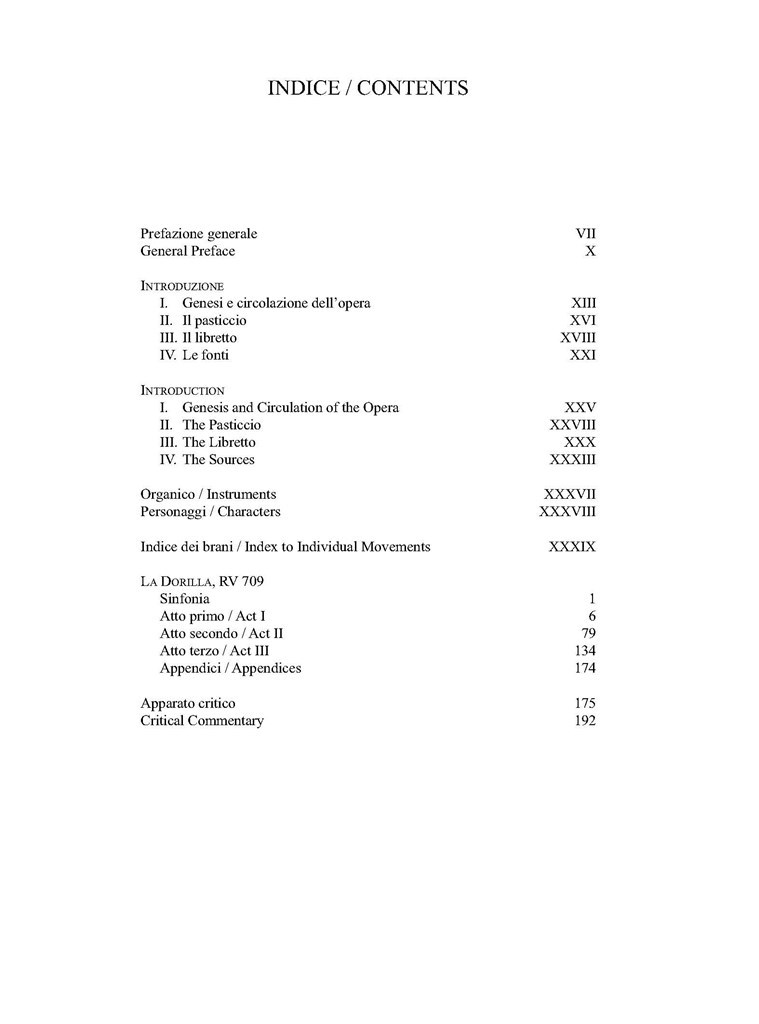 The present reduction derives from the critical edition of the score, published in this catalog in November 2019. Antonio Vivaldi's La Dorilla, a heroic-pastoral opera on a libretto by Antonio Maria Lucchini, was premiered at the Teatro Sant'Angelo in Venice on 6 November 1726. Six years later it was revived in a much shortened and altered form at the Sporck Theatre in Prague. In 1734 it returned for the last time to the Venetian stage at the Teatro Sant'Angelo, where, despite being greatly revised, it was once again successful. Many of its recitatives had been shortened and several arias replaced, some with movements borrowed from other operas by Vivaldi and some with arias taken from ones by other composers, such as Johann Adolf Hasse, Geminiano Giacomelli, Domenico Sarro and Leonardo Leo. The adaptation was the work of the Venetian man of letters Bartolomeo Vitturi, who adjusted the libretto with the precise aim of satisfying the demands of the public, which wished to hear the most famous pieces by the composers who were fashionable in those years. This vocal-score edition includes a synthetic introduction of the historical context, the description of the main source employed and a choice of the critical Notes to the musical text.