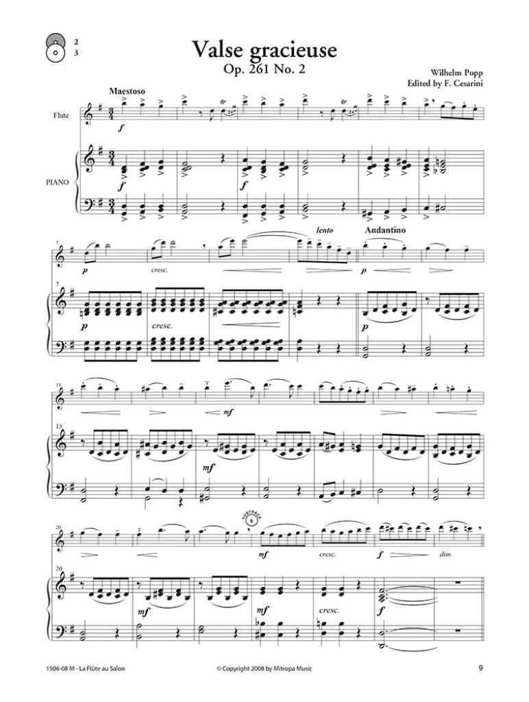 Valse gracieuse Op. 261 #2 Popp, Wilhelm Scherzino Op. 55 #6 Andersen, Joachim Romance Op. 41 Brun, Georges Barcarolle et Tarantella Op. 70 #2 Molique, Bernhard Mazurka de Salon Op. 16 Doppler, Albert Franz Souvenir des Alpes Op. 27 #1 Böhm, Theobald Csárdás Monti, Vittorio