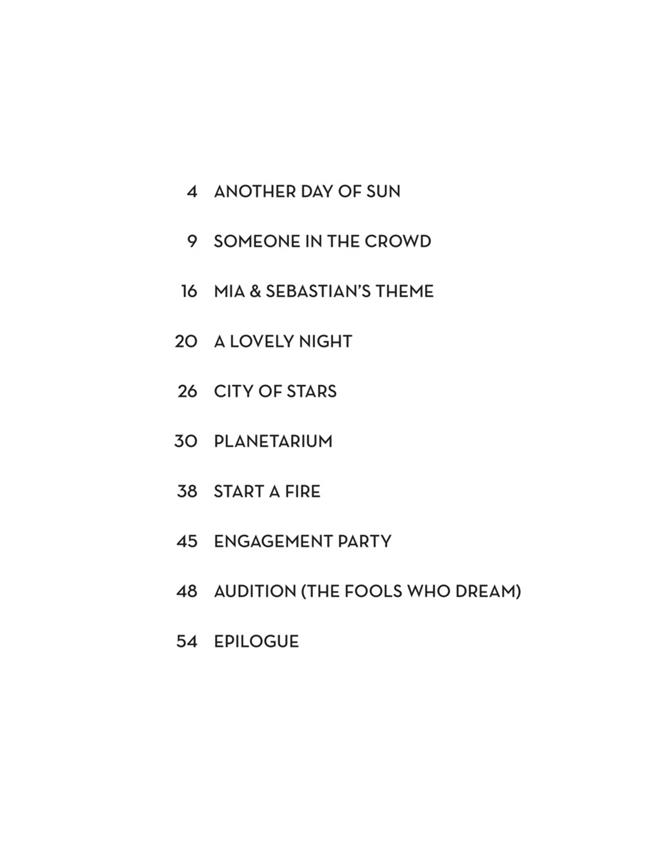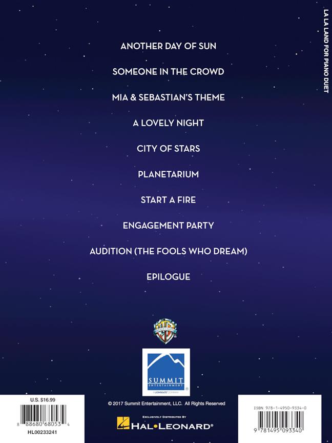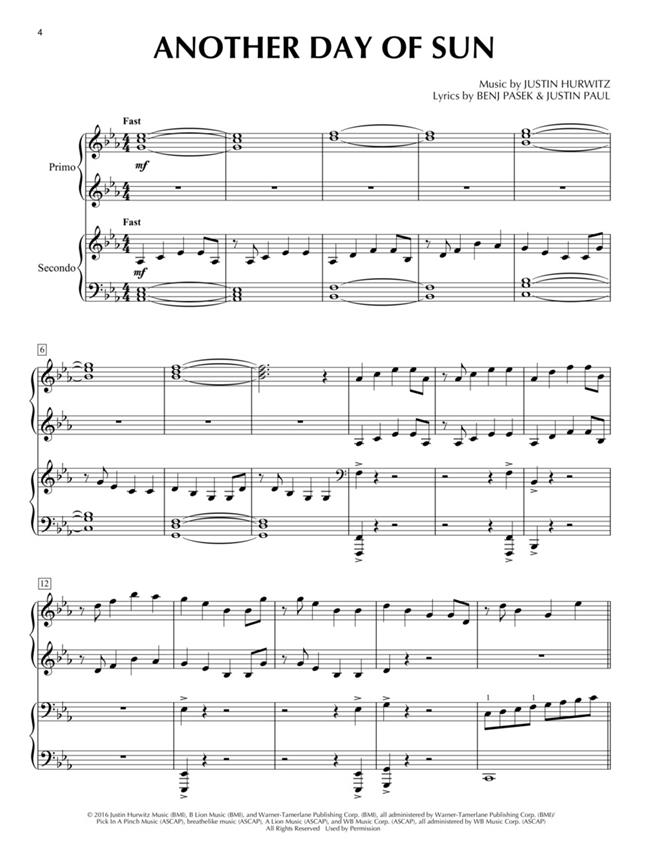 All the great songs from the movie arranged for one piano, four hands! Includes: Another Day of Sun - Someone in the Crowd - Mia and Sebastians Theme - A Lovely Night - City of Stars - Planetarium - Start a Fire - Engagement Party - Audition (The Fools Who Dream) - Epilogue.