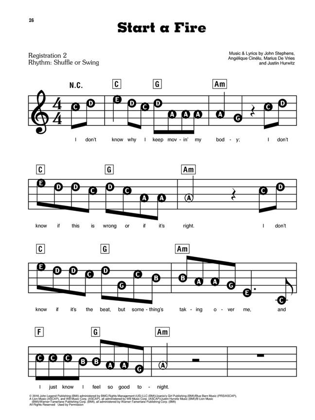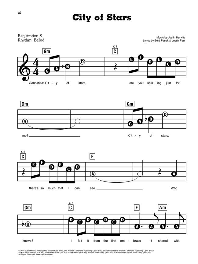 9 selections from this Academy Award winning movie musical, arranged in our easy to read and play E-Z Play Today notation. Include: Another Day of Sun - Audition (The Fools Who Dream) - City of Stars - Engagement Party - Epilogue - A Lovely Night - Mia and Sebastian's Theme - Someone in the Crowd - Start a Fire.