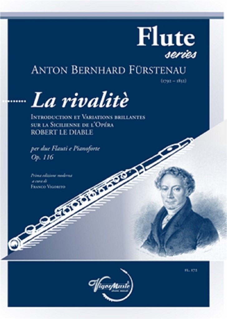 Anton Bernhard Fürstenau (Münster, October 20, 1792-Dresden, November 18, 1852) was the most important virtuoso flutist of German Romanticism… La Rivalité is in D major and is made up of an Introduction (Andante Majestic, C) and the Sicilienne "O fortune à ton caprice" (Allegro con Spirito, 6/8) with 4 variations, taken from the finale of the first act of Robert le diable by Meyerbeer.