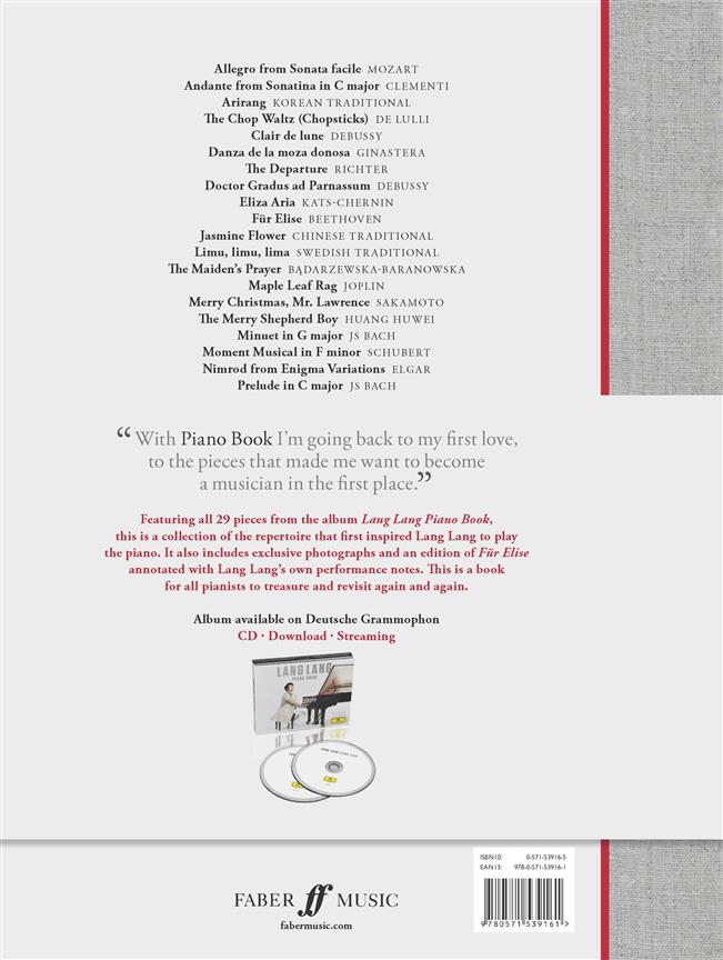 Featuring all 29 pieces from the album Lang Lang Piano Book, this is a collection of the most significant pieces from Lang Lang's personal musical journey. It is beautifully presented as a high-end cased book, featuring marbled endpapers, page-finder ribbon and sewn binding. It includes exclusive photographs, comments from Lang Lang on every piece and an edition of Für Elise annotated with Lang Lang's own performance notes. This is a book for all pianists to treasure and revisit again and again.